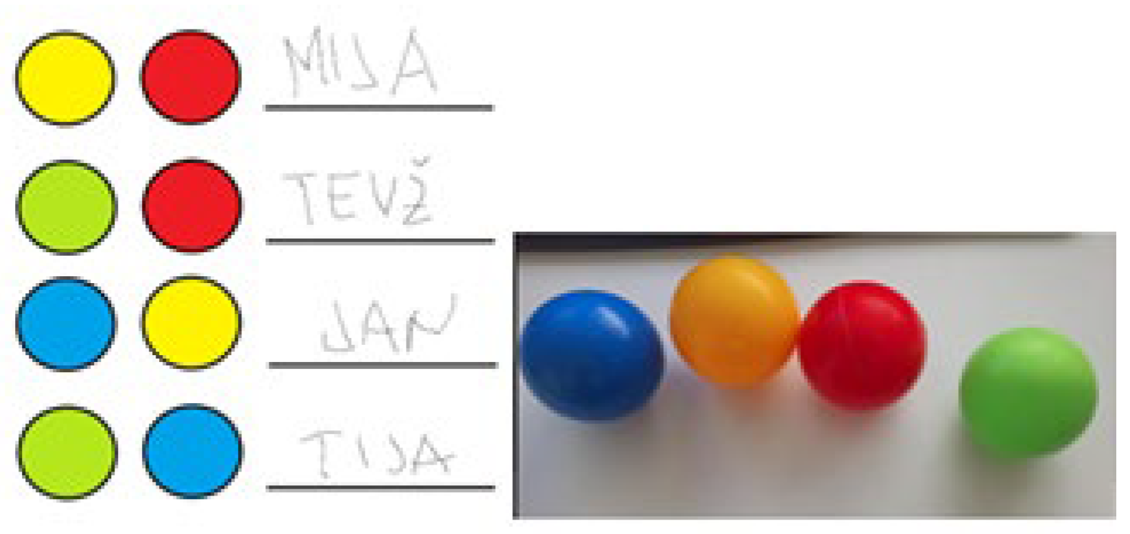| Dialogue 1 | The children look for combinations of two colors of balls out of four. |