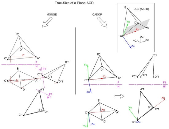 | True-Size View of a Plane | Construct an edge view of the plane, then create a second view perpendicular to this edge. | Create a UCS on the plane using three non-aligned points; the UCS top view reveals true size. |