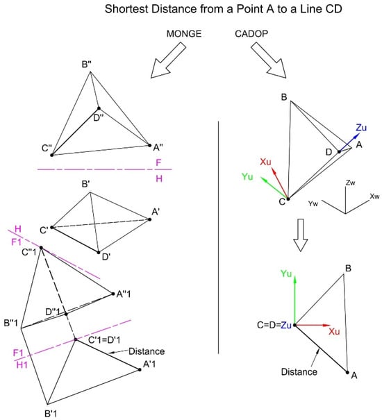 | Shortest Distance from a Point to a Line | Construct a point view of the line and drop a perpendicular from the point. | Align UCS on the plane defined by the point and the line; draw perpendicular and measure the distance. |