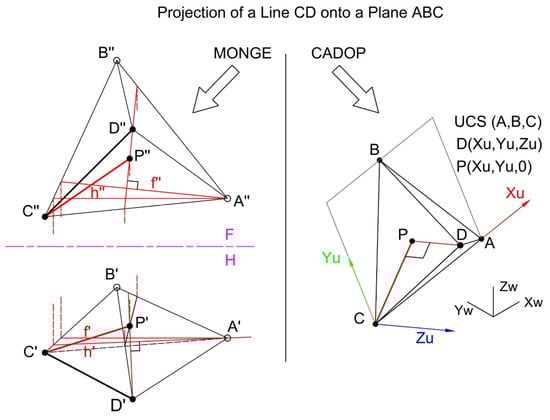| Projection of a Line onto a Plane | The endpoints of the line are projected orthogonally onto the plane; the projected points define the line’s projection on the plane. | Align the UCS XY-plane with the target plane; then set the UCS Z-coordinate (Zu) of the line’s endpoints to zero to obtain its projection on the plane. |