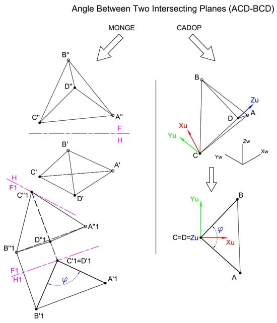 | Angle Between Two Intersecting Planes | Construct edge views of both planes; measure the angle between them. | Match UCS Z-axis to the intersection line; measure angle from top view. |