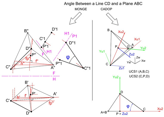 | Angle Between a Line and a Plane | Display the line in true length and the plane in edge view, then measure the angle. | Project line onto the plane in UCS; measure angle between original and projected lines. |