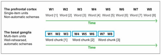 Research in animals demonstrates that, with sufficient repetition, the basal ganglia exert motor chunking (, ; , , ; ). ‘Motor chunking’ is the term used to refer to the process of recoding action sequences into ‘motor chunks’ (). According to (), a motor chunk is an action-related cluster. It consists of multiple acts that together form a unit of motor (procedural, action-related) memory. (; ; ). () emphasises that, once acquired (ingrained in memory through repetition), motor chunks are automatically planned and produced in a specific temporal order by the basal ganglia, e.g., motor chunk [1] + motor chunk [2] + motor chunk [3] + motor chunk [4]. () specifies that chunking acts as a mechanism for “information compression” (p. 119), meaning that it reduces cognitive load. This cognitive strategy facilitates information processing, thereby supporting the acquisition and automatic expression of action sequences. Consequently, chunking enhances brain efficiency (; ).