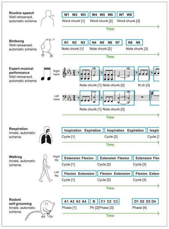 Fixed action patterns generate species-specific innate behaviours, such as self-grooming in rodents and egg rolling in greylag geese (; ). Some researchers argue that these schemas can be elicited from an animal that has never watched the pattern performed by another animal. Thus, fixed action patterns are considered to be genetically inherited but not learned. In addition, these schemas are so fixed (standardised) that all members of a species always exhibit the same sequence of components (; ). Specifically, a fixed action pattern constitutes an innate (instinctive, automatic), highly stereotyped (rigid, predictable), well-timed sequence of acts. Once initiated, the pattern runs to completion (; ). For instance, rodent self-grooming is an action schema built from four phases. Each of these groups of acts is composed of one instance or several repetitions of a particular movement: (i) 5–9 elliptical strokes; (ii) 1–2 unilateral strokes; (iii) 3–6 bilateral strokes; (iv) several body licking movements (; ). Figure 5 presents some well-rehearsed and innate chunk-based action schemas.
