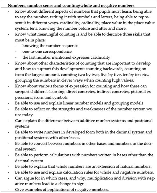 This theme is an example that the bilingual pre-service teachers were expected to hold the same quality and standards as the regular Norwegian pre-service teachers. The course maintained the same depth and rigor as the regular Norwegian teacher education program, and in addition to mastering specific content, the pre-service teachers were expected to make broader reflections on teaching and the national curriculum. Consequently, regardless of the themes they drew, they were expected to connect with the general topics listed in Figure 3. That is, the pre-service teachers were expected to relate the more specific themes like counting to the more general didactical concepts with respect to the curriculum and how to develop competence in mathematics. As an example, we would expect that when the pre-service teachers talked about meaningful counting, they could discuss the point “the last number mentioned expresses cardinality” in relation to the core element in the curriculum on abstraction and generalization and describe activities with pupils in terms of productive and reproductive practicing, this way demonstrating in depth understanding not only of the mathematical content, but also of didactical aspects.