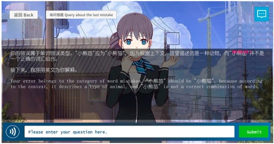 Although the tutor offers on-demand corrective feedback, its responses extend beyond mere error correction. For incorrect answers, the system explains not only the linguistic rule but also the conceptual rationale behind the correct form, aligning with best practices in form-focused instruction. As illustrated in Figure 1, when learners click the “Query about the last mistake” button, the system not only identifies the error category (e.g., word mistakes) but also provides a bilingual explanation that clarifies the linguistic rule and contextual meaning.