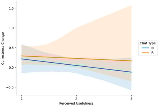 Spearman correlation analysis revealed no significant relationship between PE and change in correctness, either in the content-relevant group (ρ = −0.045, p = 0.873) or the content-irrelevant group (ρ = −0.214, p = 0.294). Figure 2 further illustrates the relationship between PE and changes in correctness. The x-axis represents learners’ satisfaction ratings of the tutor’s response (1 = very satisfied, 3 = dissatisfied), while the y-axis shows the change in correctness. The orange and blue lines represent trend lines for the content-relevant (R) and content-irrelevant (N) groups, respectively. Shaded areas indicate the 95% confidence intervals. As shown in Figure 2, both trend lines are nearly flat, suggesting no clear linear relationship between satisfaction ratings and performance change within either group. These findings indicate that learners’ PE of the LLM-driven tutor did not have a measurable impact on their immediate cognitive performance.