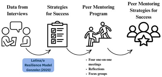As part of a larger study focused on studying Latinas in STEM undergraduate success, we utilized the findings from interviews completed within the same institution to develop the peer mentorship program (Figure 1). The interview findings consisted of experiences and success strategies gathered from Latina undergraduate STEM majors, which were conceptually framed by a model of Latina/o resilience as its theoretical framework (), a model that takes community cultural wealth (CCW) by () as a foundation. These success strategies were then used to develop a peer mentoring one-on-one program, of which the following data is based on (see Figure 1). Specifically, success strategy themes identified from interviews were utilized as topics of discussion and reflection for mentors and mentees.