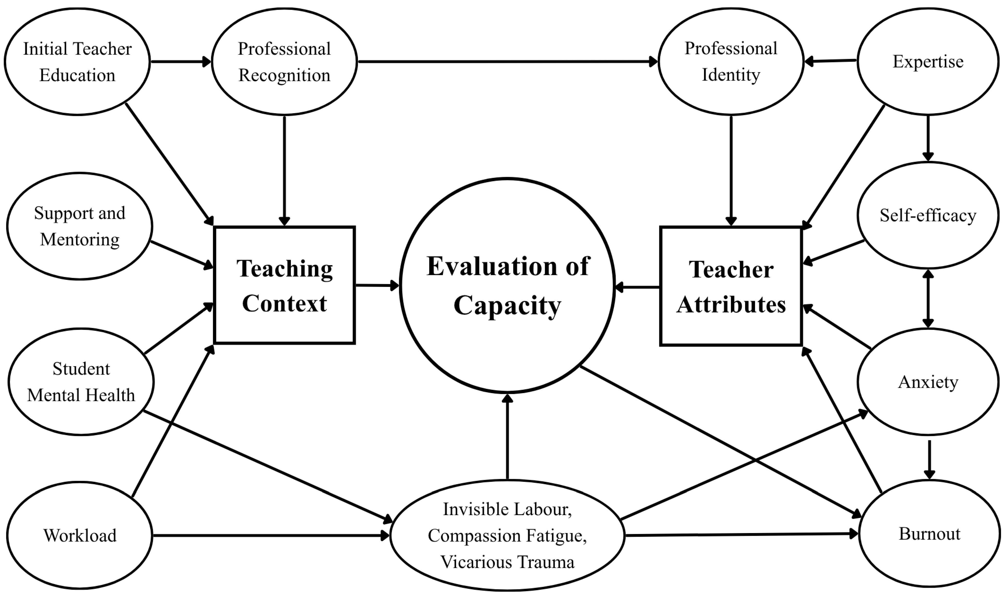 - Oberg, G., Macmahon, S., & Carroll, A. (2025). Assessing the interplay: Teacher efficacy, compassion fatigue, and educator well-being in Australia. Australian Educational Researcher, 52, 1105–1131. [Google Scholar] [CrossRef]