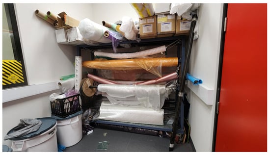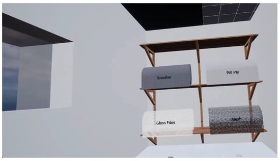 Figure 4, Figure 5 and Figure 6 illustrate the key stages and visual components of the VR environment. Figure 4 presents an overview of the virtual workspace, displaying the materials shelf containing labelled rolls of Breather, Pill Ply, Glass Fibre, and Mesh. These materials replicate those used in the physical lab, and participants select them from the shelf to complete each stage of the task.