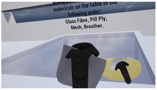 Figure 5 shows the intermediate stage in which the participant, guided by on-screen instructions, arranges the composite layers (Glass Fibre, Pill Ply, Mesh, and Breather) in the specified order using the VR controllers to grasp and position each layer accurately.