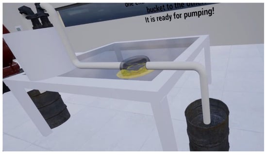 Figure 6 depicts the final stage of the process, where the participant connects tubing from the resin bucket to the sealed composite lay-up on the table, completing the vacuum setup required for resin infusion and curing. Together, these images represent the entire procedural workflow implemented in the VR simulation and mirror the equivalent stages in the physical laboratory.