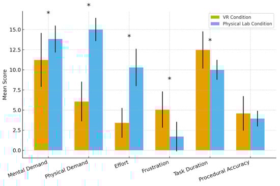 Figure 7. Comparison of mean scores across all metrics between VR and physical laboratory conditions.