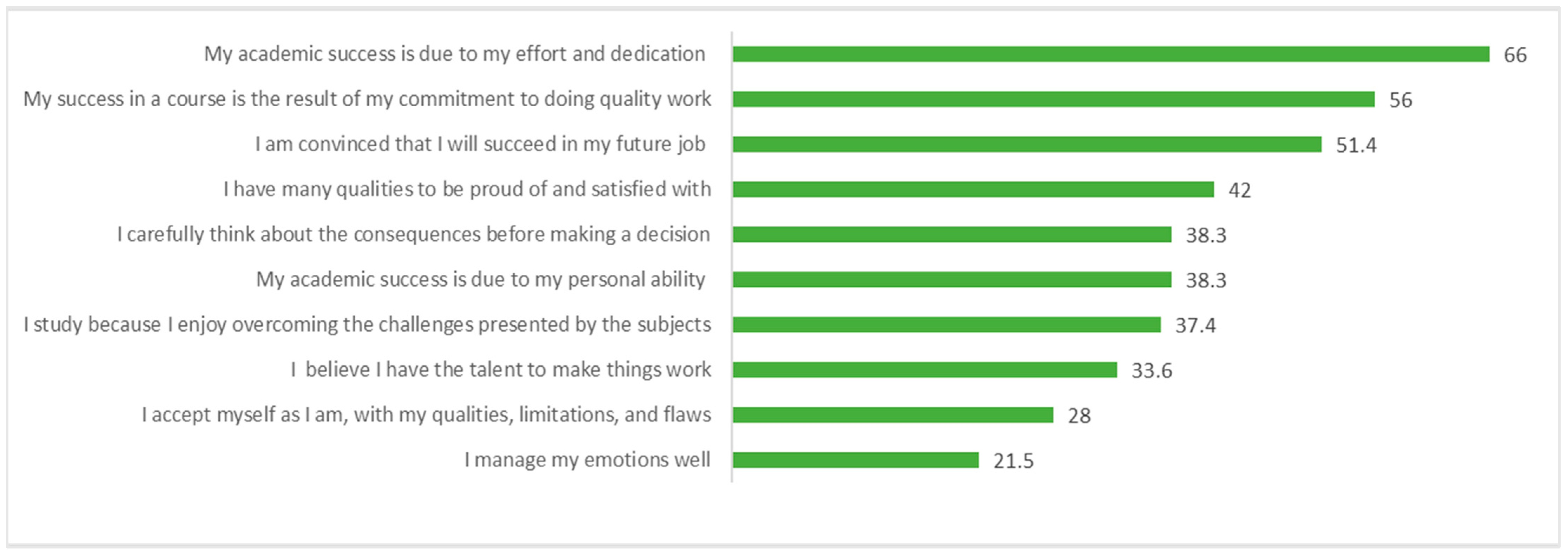 The social self-actualization dimension revealed ambivalent self-perceptions. While 73.8% of pre-service teachers reported feeling comfortable sharing with others (Item 30) and 65.5% believed they succeed in relationships (Item 18), high levels of interpersonal insecurity persist. 42% anticipated difficulties in social relationships (Item 14), and 43% attributed their failures to a lack of social skills (Item 10).