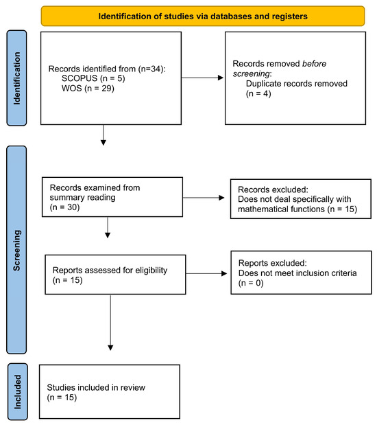 Given the fact that titles, abstracts, and keywords in papers written in any language are translated into English, the following descriptors in English were used in the search for documents: function, mathematics education, secondary teacher education, and epistemology. Based on these descriptors, the search was initiated in Scopus, restricting it to the title, abstract, and keywords. As shown in Table 2, different search structures were tested, varying the degree of restriction depending on the number of results obtained until a number between 10 and 30 was attained. The same procedure was then repeated when searching the WoS database. However, as this database has a “subject” field, the search structure was entered in that field without having to limit it to the title, abstract, and keywords.