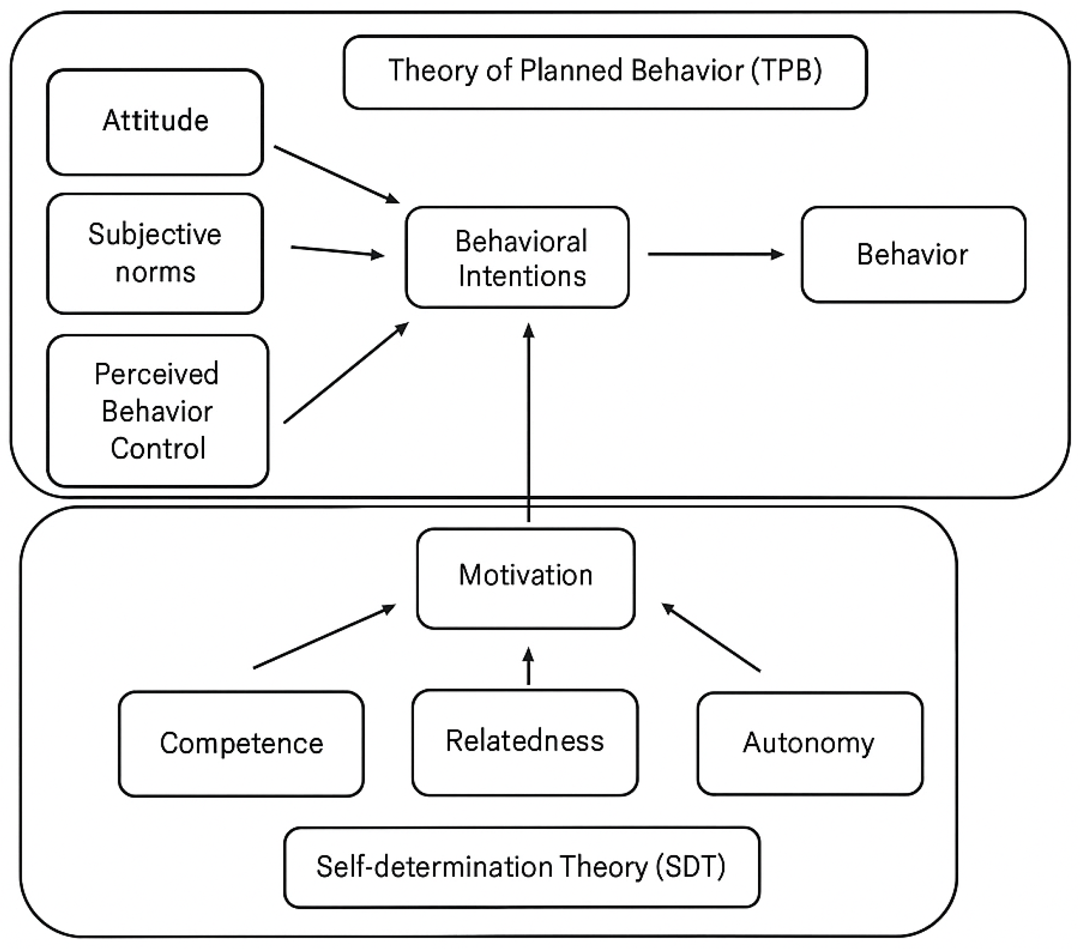 - In what ways have TPB and SDT been integrated in educational research to explain teachers’ behavioral intentions?