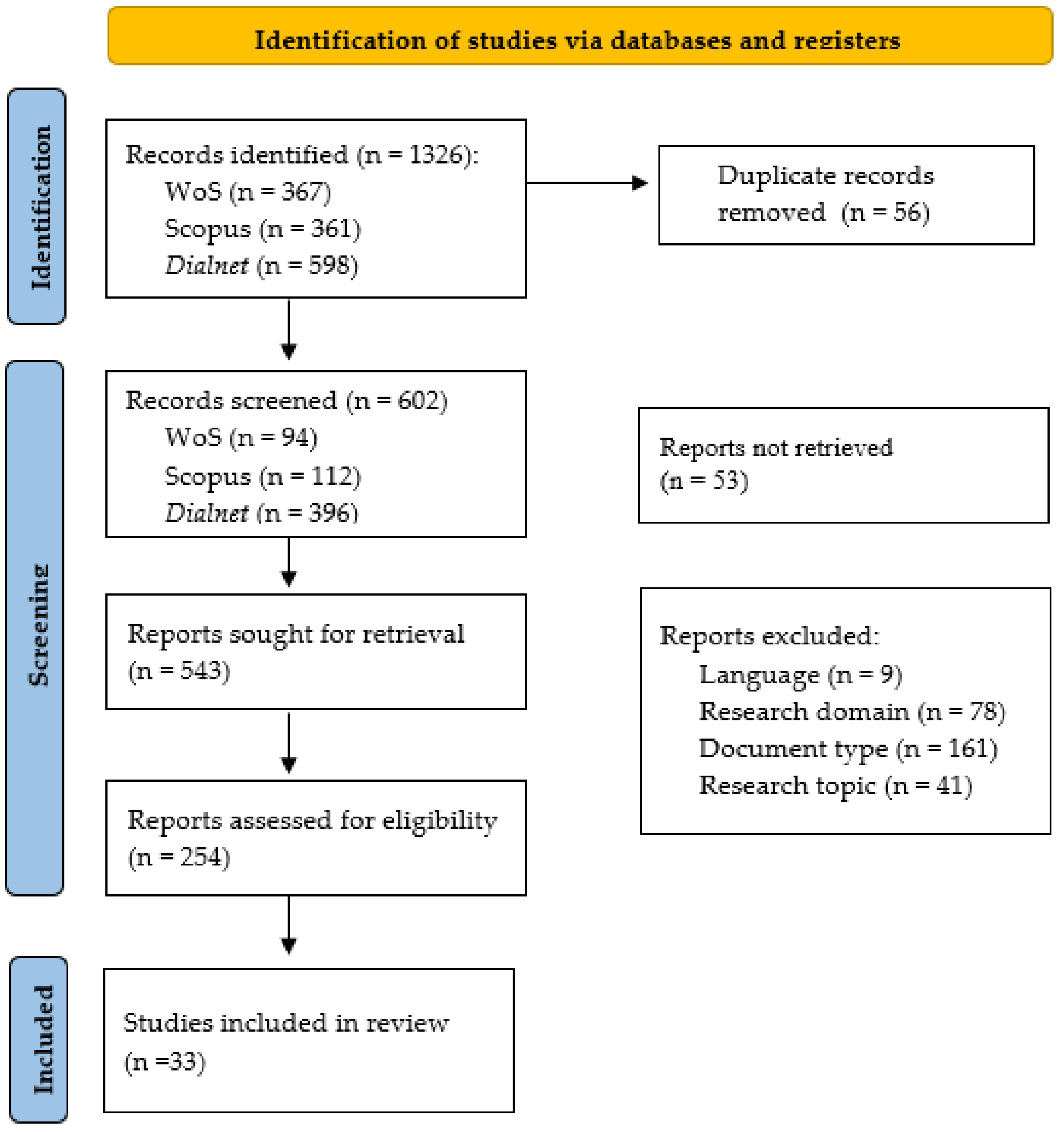 - Records that did not contain the specified descriptors in the title, keywords, or abstract, or that, although including them, did not fit the research topic.