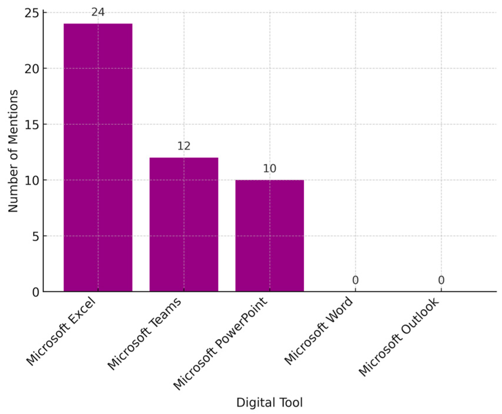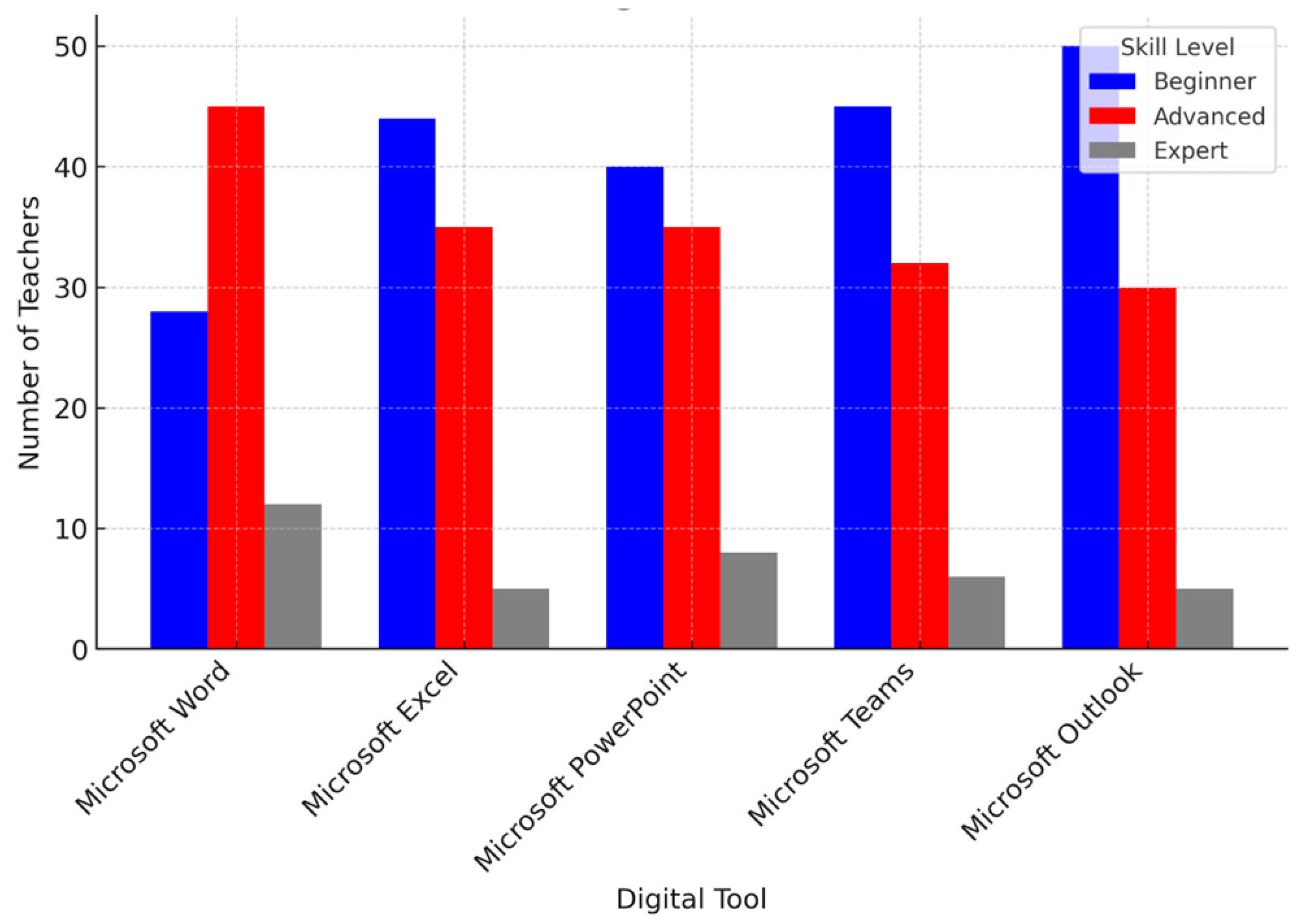 2024) found that frequent use of Excel and PowerPoint reinforces teacher confidence, although uptake of less common tools remains limited. In contrast,