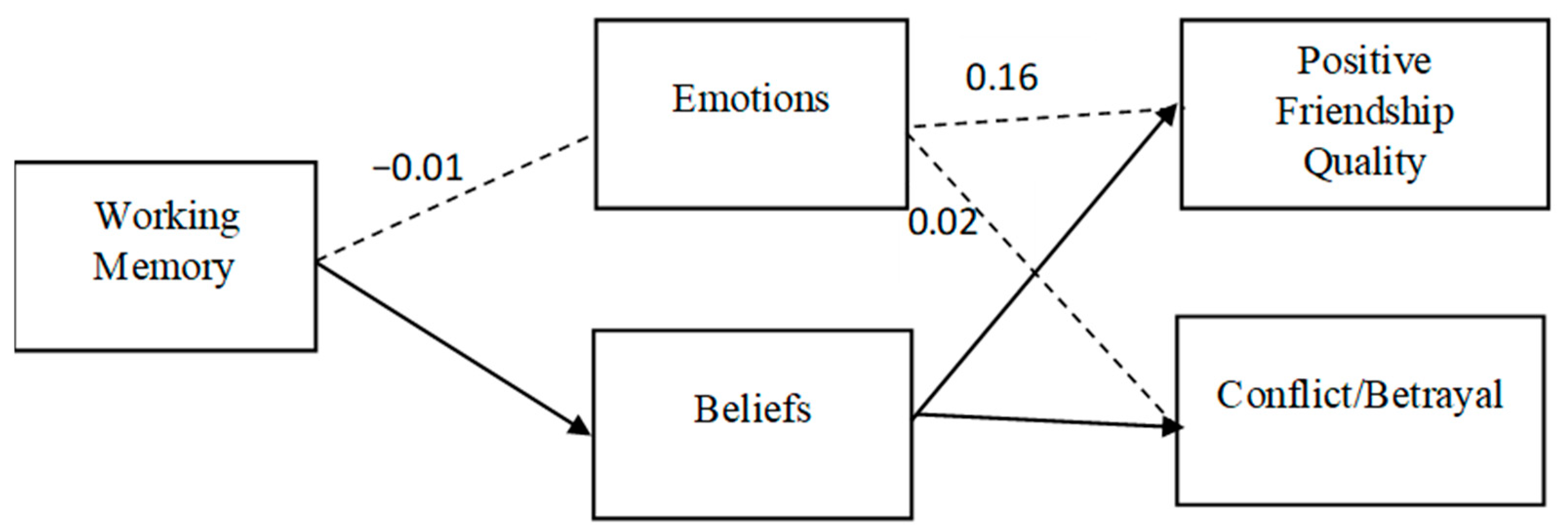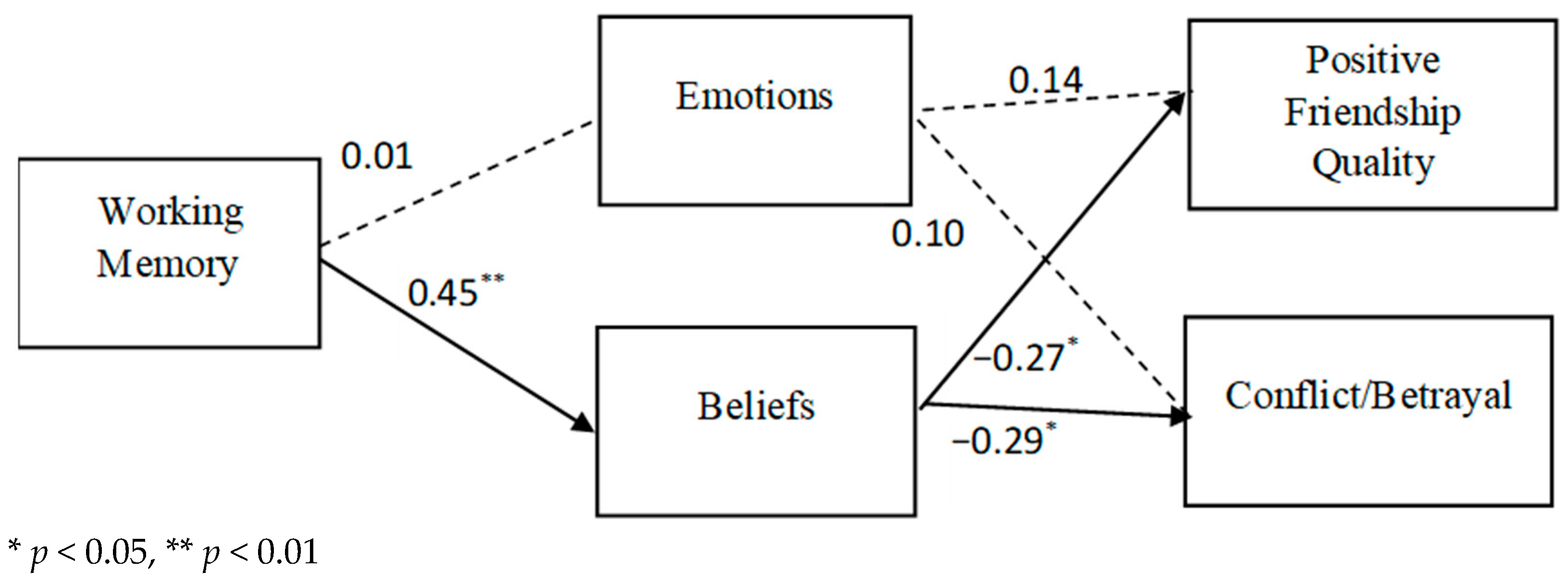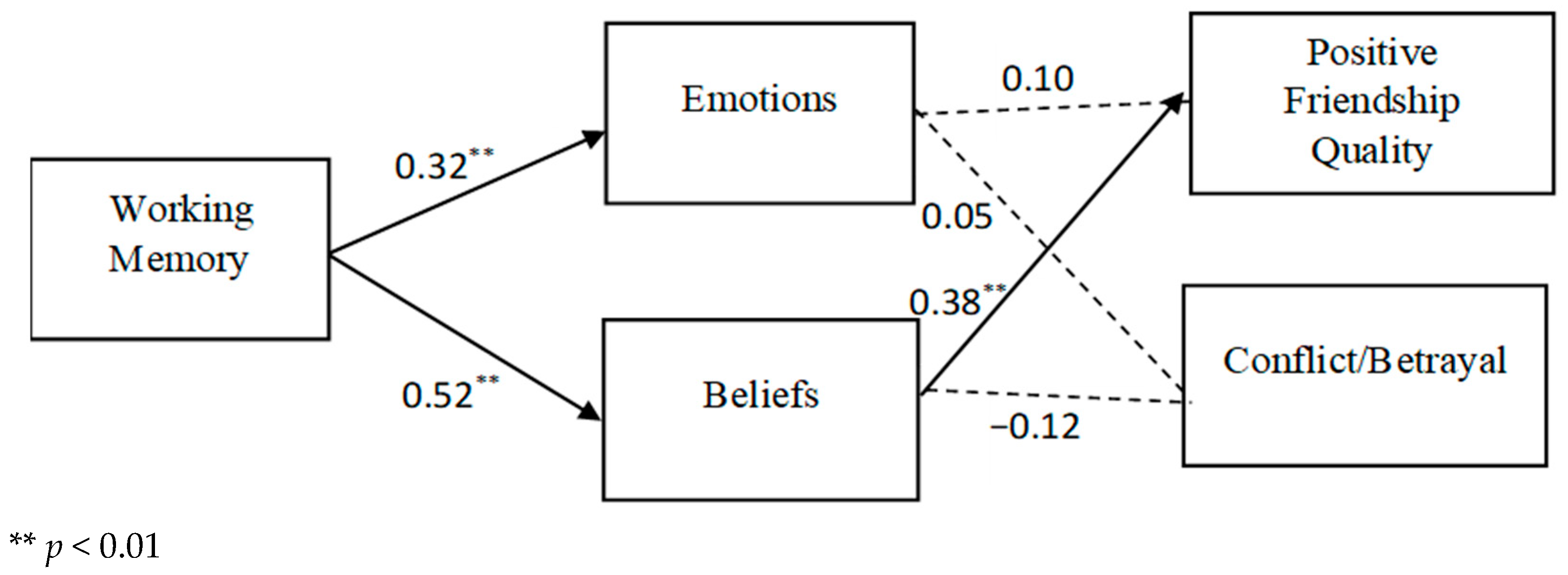- Wang, X., & Feng, T. (2024). Does executive function affect children’s peer relationships more than emotion understanding? A Longitudinal study based on latent growth model. Early Childhood Research Quarterly, 66, 211–223. [Google Scholar] [CrossRef]