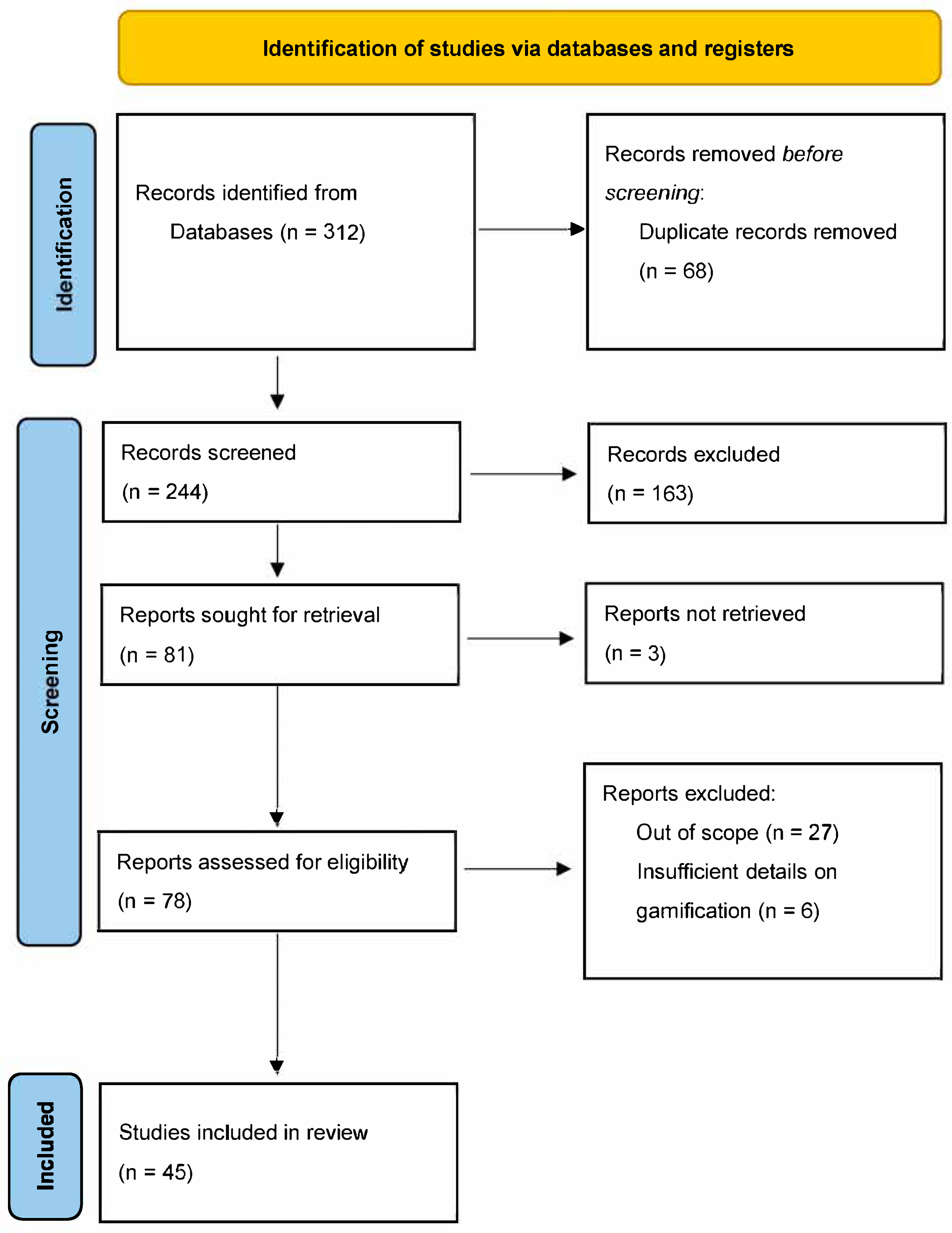 A PRISMA-style approach was used in the study selection process for this review. Database searches initially identified 312 records across education and language learning databases. After removing 68 duplicates, 244 titles and abstracts were screened for relevance. Ultimately, 78 full-text articles were assessed for eligibility. Of these, 33 were excluded due to focus on non-classroom settings or insufficient reporting of gamification interventions. The remaining 45 studies met all inclusion criteria and were included in the final synthesis (n = 45). Data extraction captured study characteristics, gamification elements, outcome measures, assessment timing, and contextual constraints. Extracted data were checked for accuracy and consistency. Although formal quality appraisal was not conducted, studies were evaluated for sample size, measurement reliability, and clarity of intervention reporting. A narrative review approach was used for reporting the findings. The choice of a narrative review approach was informed by the nature of the studies that met the inclusion criteria. These studies showed heterogeneity across study designs, outcomes, and reporting practices. Also, the studies had varied participant groups, gamification tools, and measurement instruments. So, it was not possible to mix the heterogenous studies for common statistical analysis. A narrative approach allowed us to integrate the evidence across these heterogenous studies and highlight patterns for a richer contextual understanding. The formal process of article selection helped to minimise bias in the review process. Figure 1 below highlights the process of article selection.