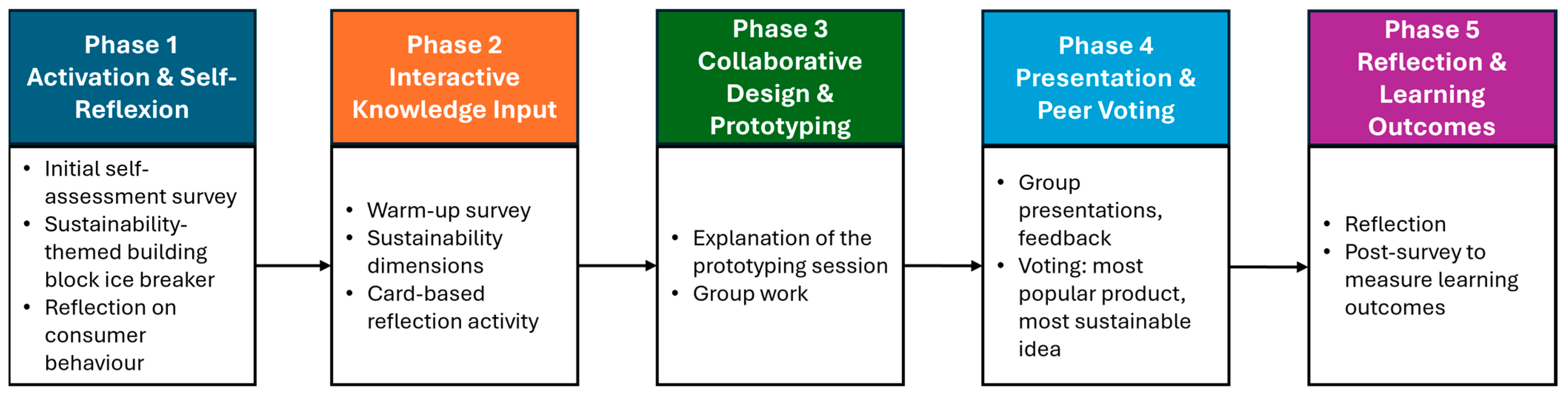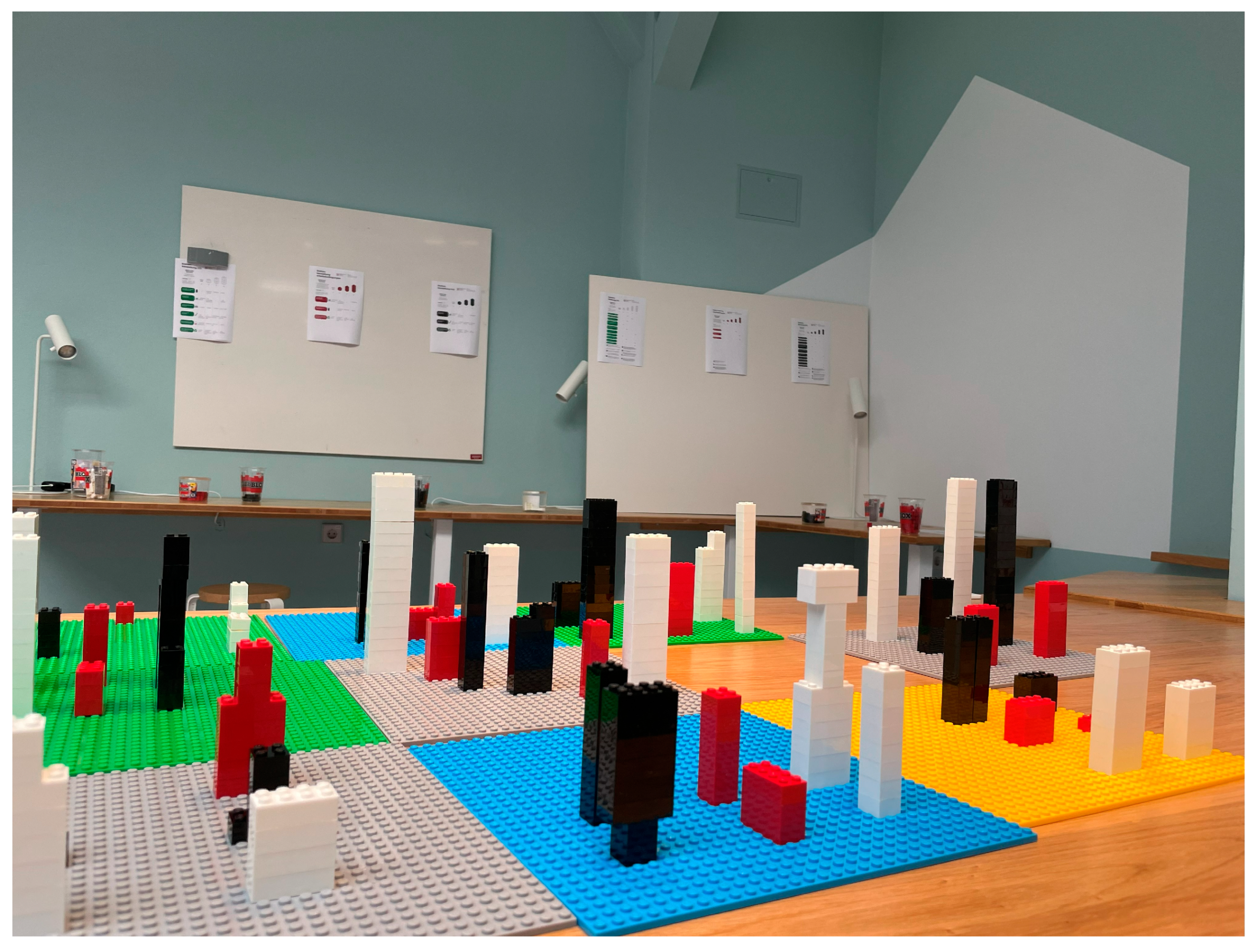 - Building blocks and building guides: Used in phase 1 to visually and physically represent sustainability impacts, enhancing engagement and comprehension through multisensory learning.