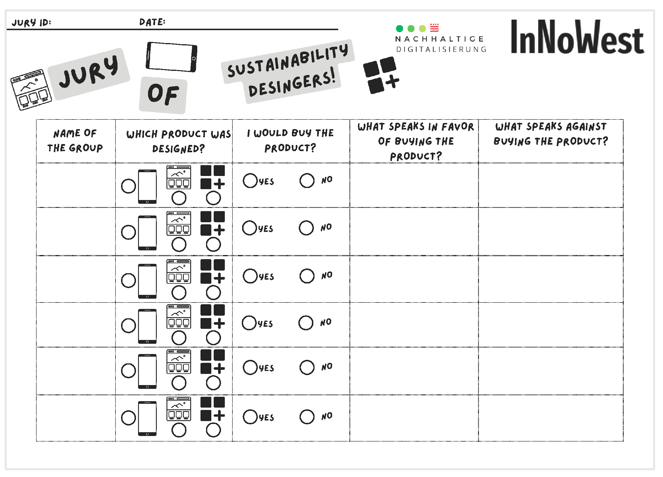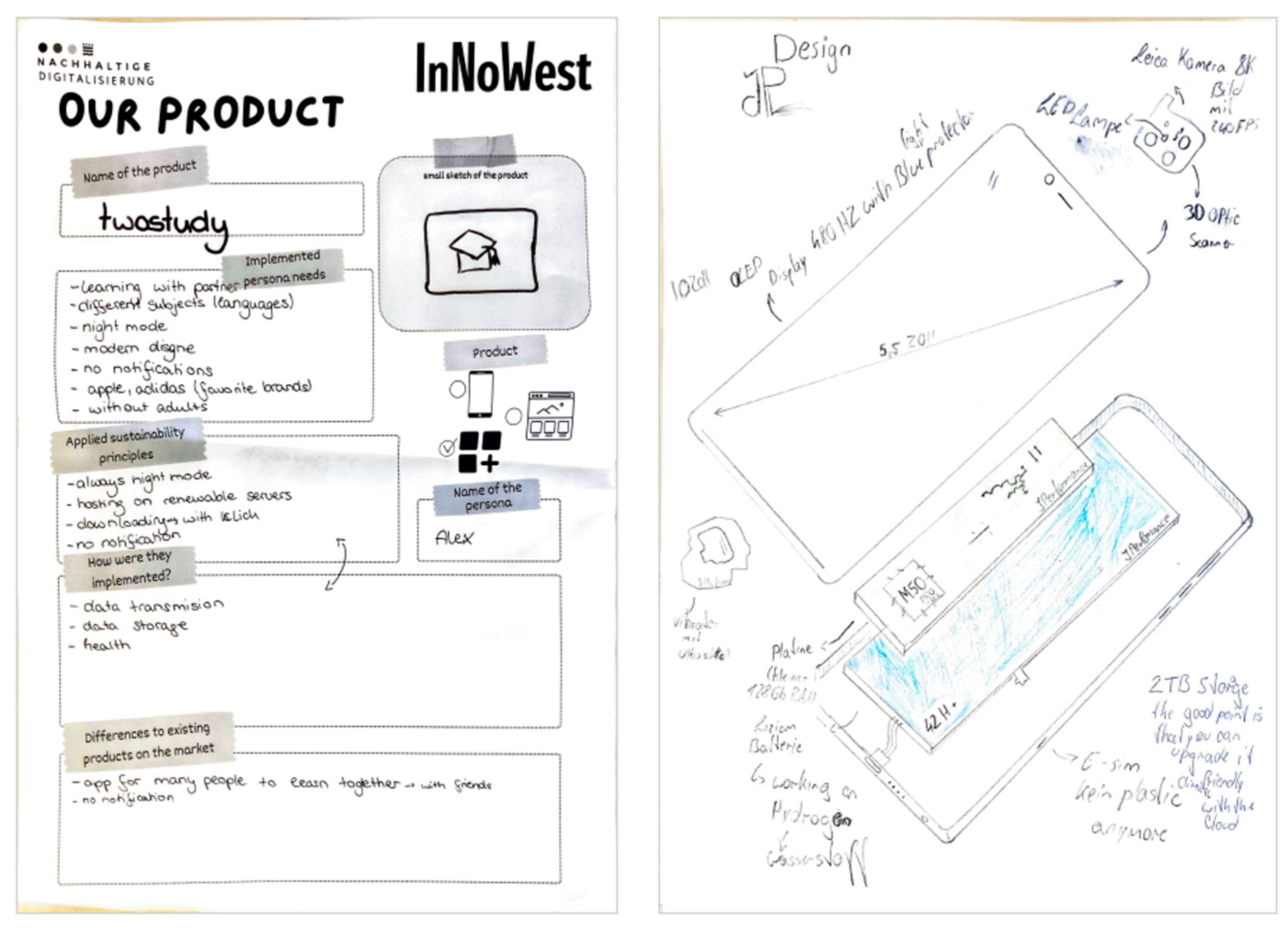 - Sustainability catalogues: Used in phase 3, structured sustainability criteria assist participants in critically analyzing paper-based prototypes along environmental, economic, and social lines.
