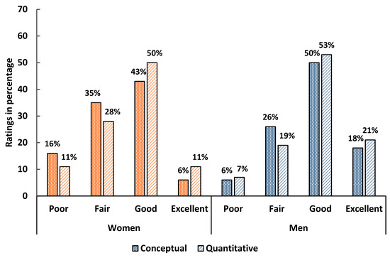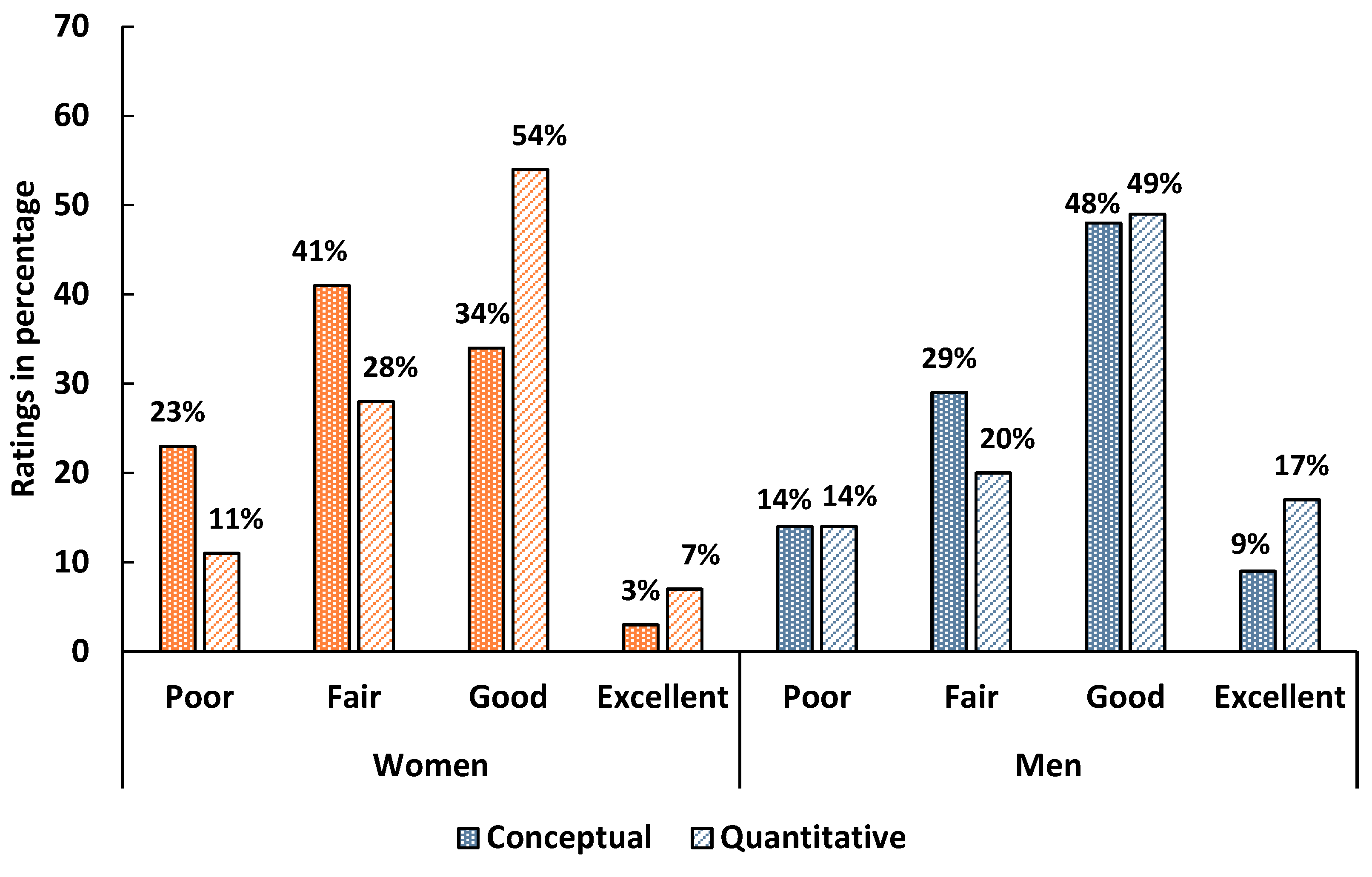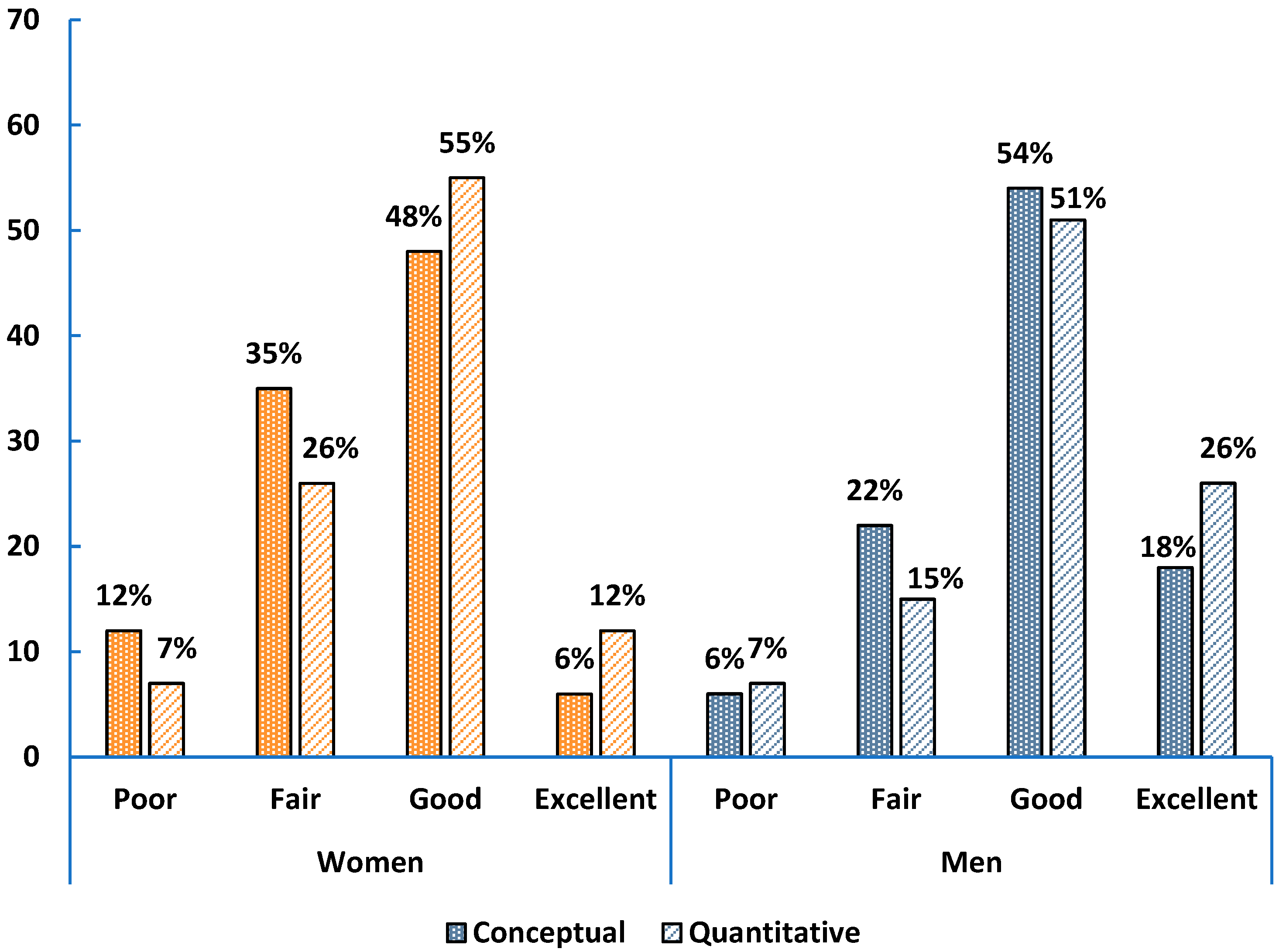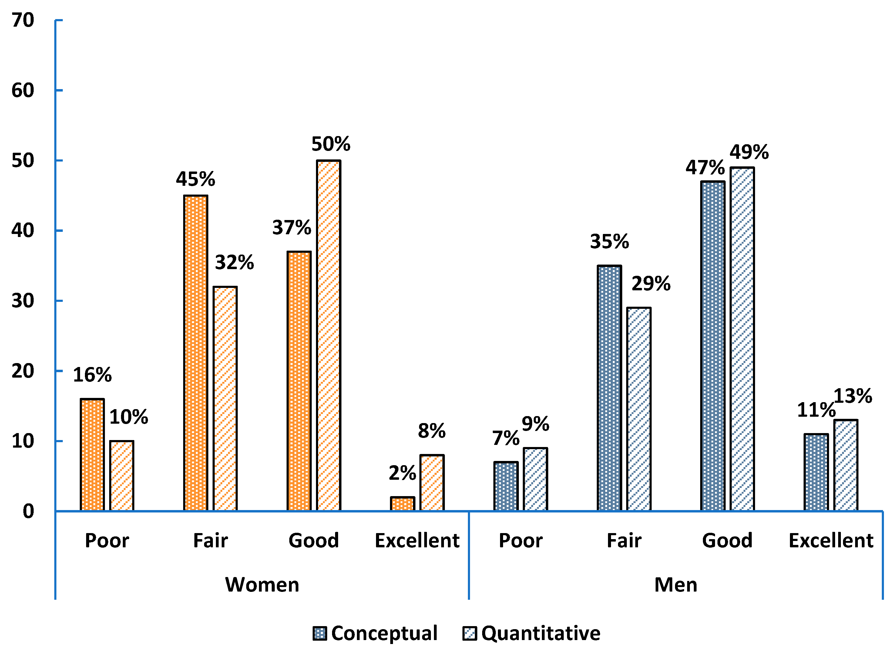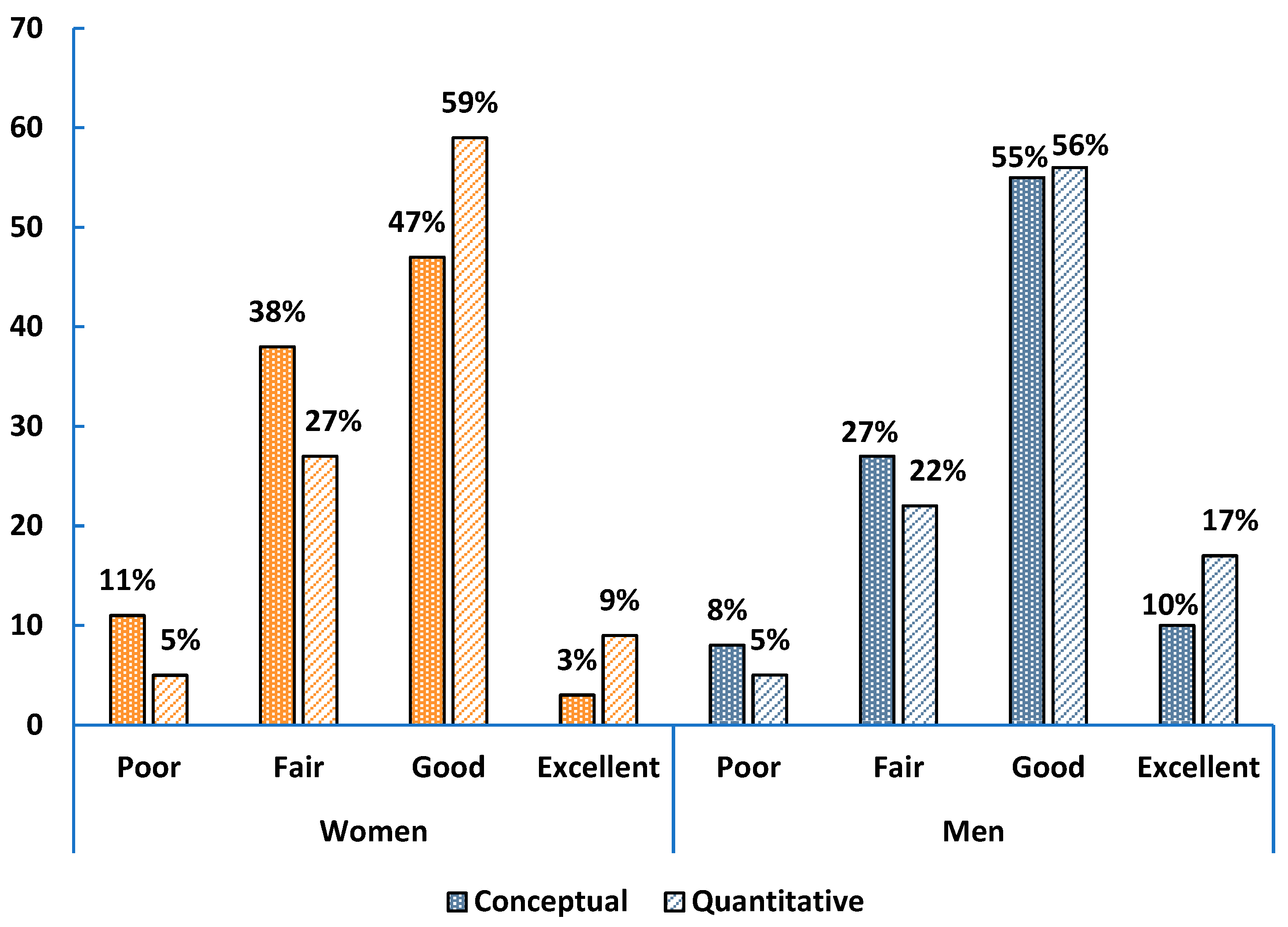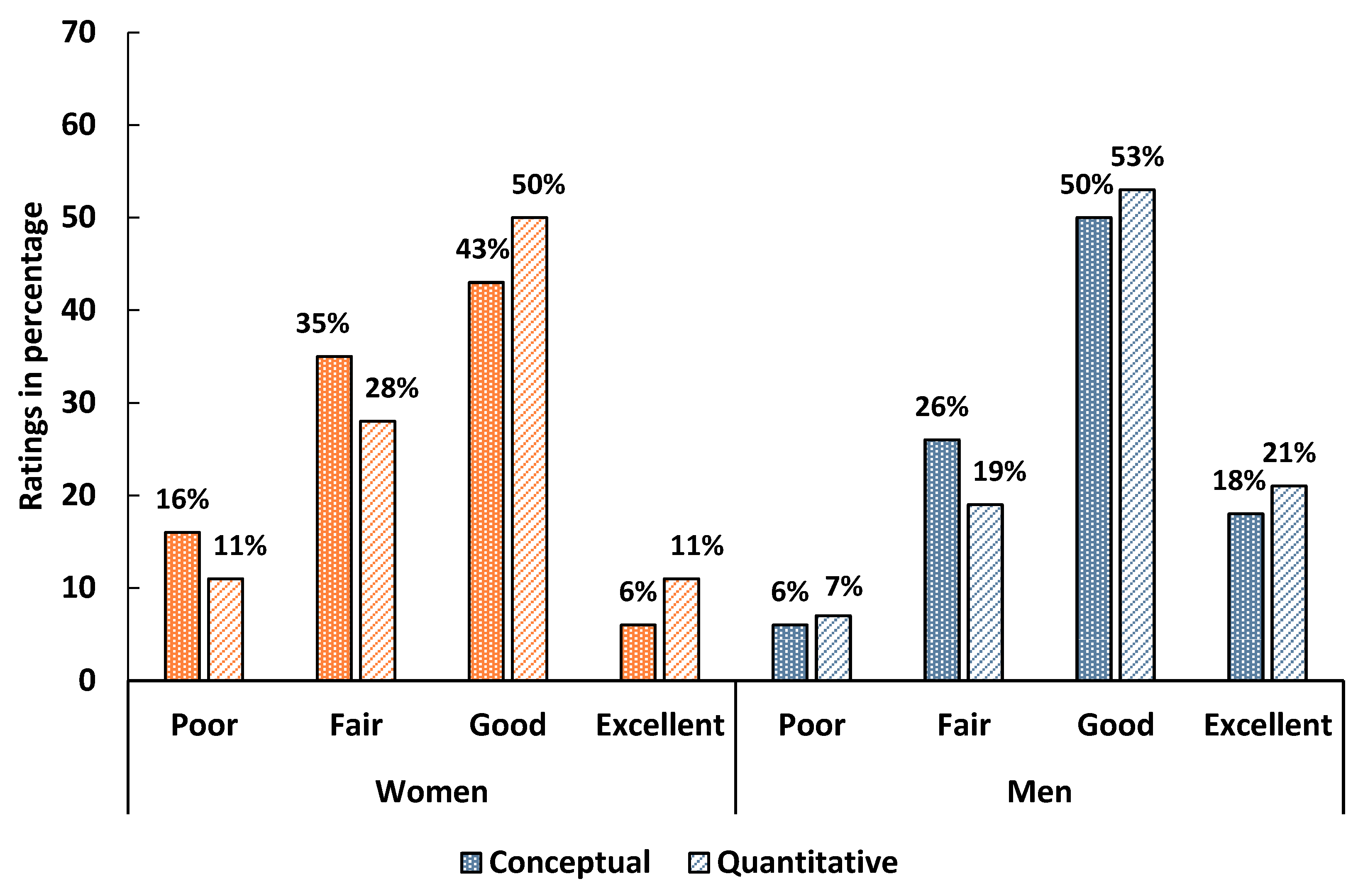 For clarity in data presentation, quantitative data were analyzed using descriptive statistics, with Likert-scale responses collapsed into broader categories. We grouped the responses for self-assessment items into four categories: Poor (combining Very Poor and Poor), Fair, Good (combining Good and Very Good), and Excellent (combining Excellent and Exceptional). We then calculated and compared the percentages of women and men who rated their conceptual and quantitative skills in each category, presenting the results in bar graphs for clarity.