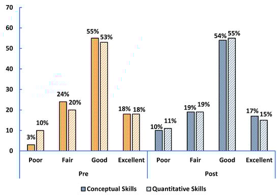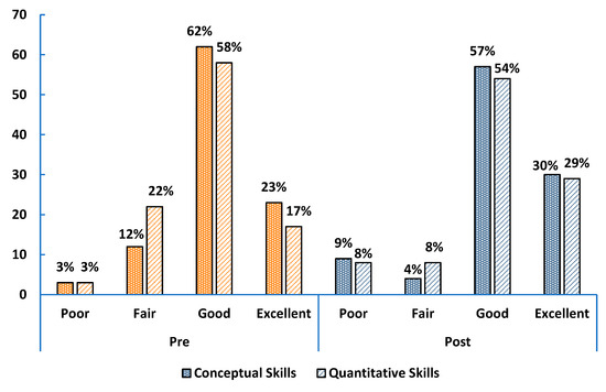 Self-assessed conceptual and quantitative problem-solving skills of upper-level undergraduate physics students (orange bars for pre-survey and blue bars for post survey).