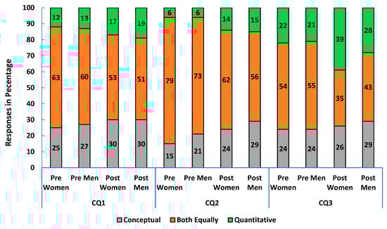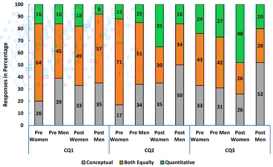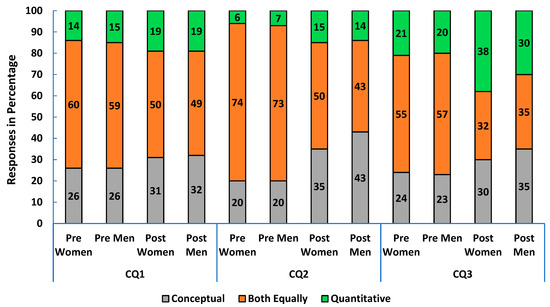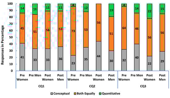In algebra-based physics 1, most students wanted the course to balance conceptual and quantitative emphasis or strengthen conceptual skills. Over 70% of both women and men expected their instructor to favor this balance in the pre-survey. By course end, many students, especially women (38% vs. 30% of men) felt the course focused more on quantitative skills (CQ3 in Figure 5).