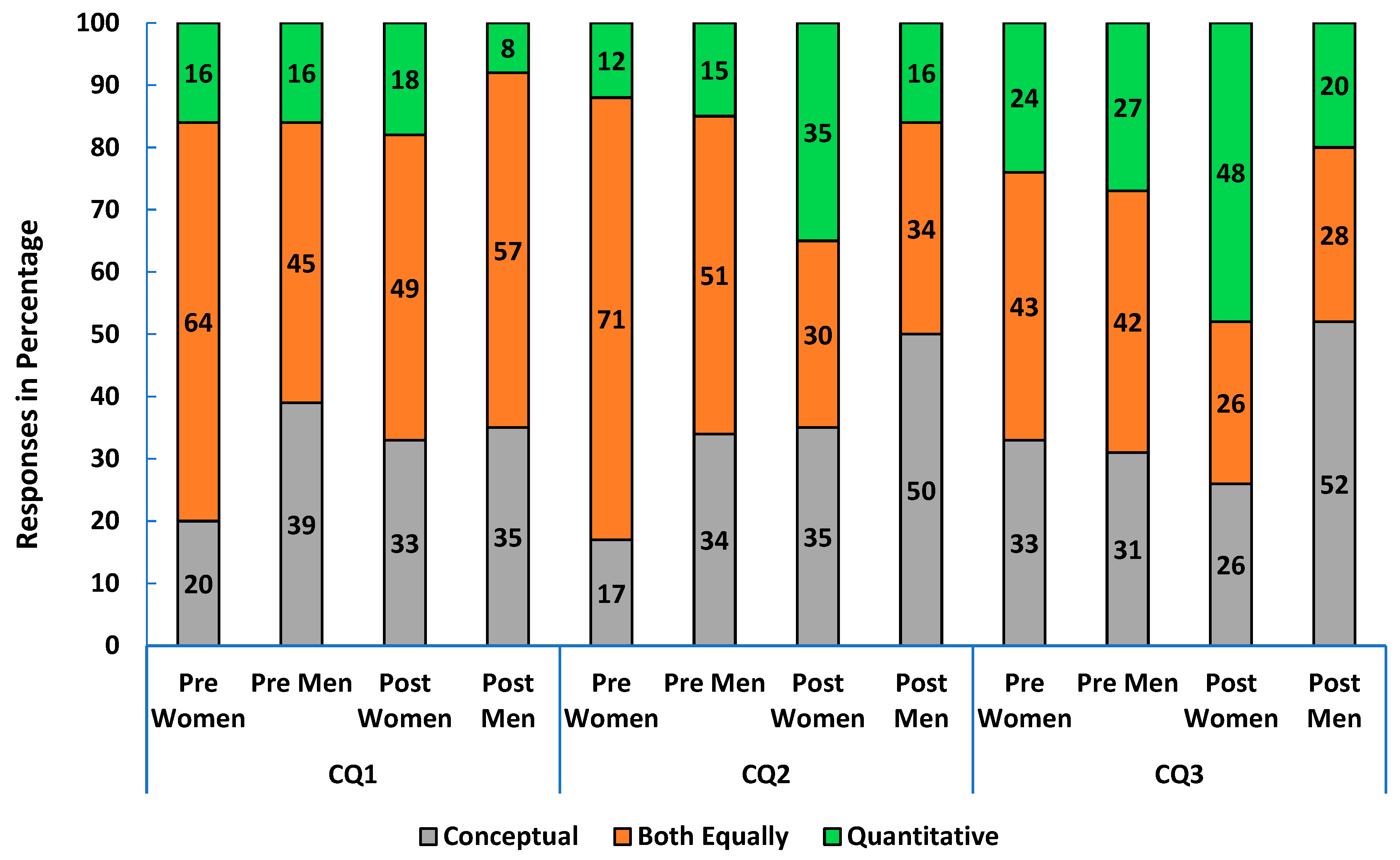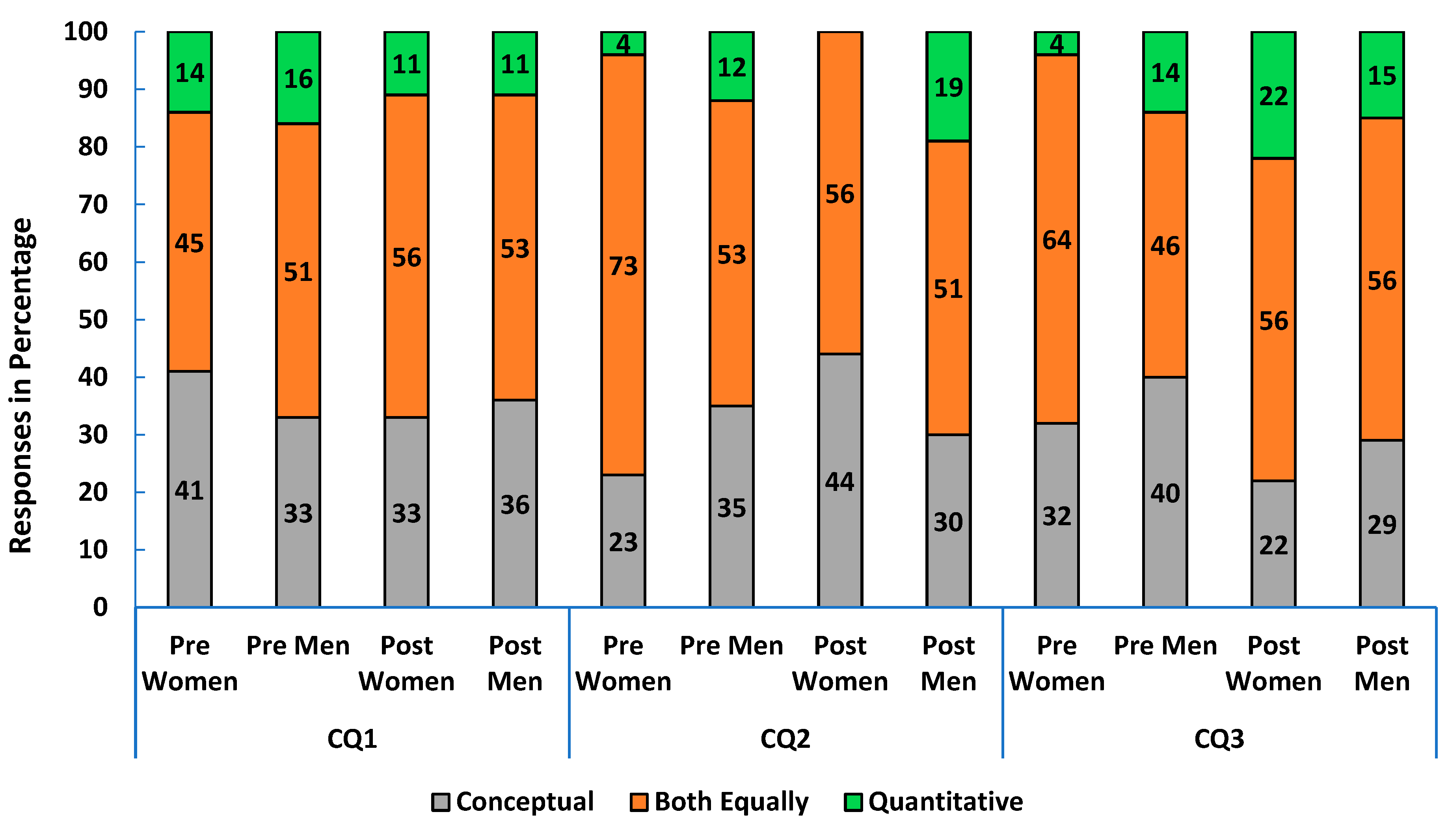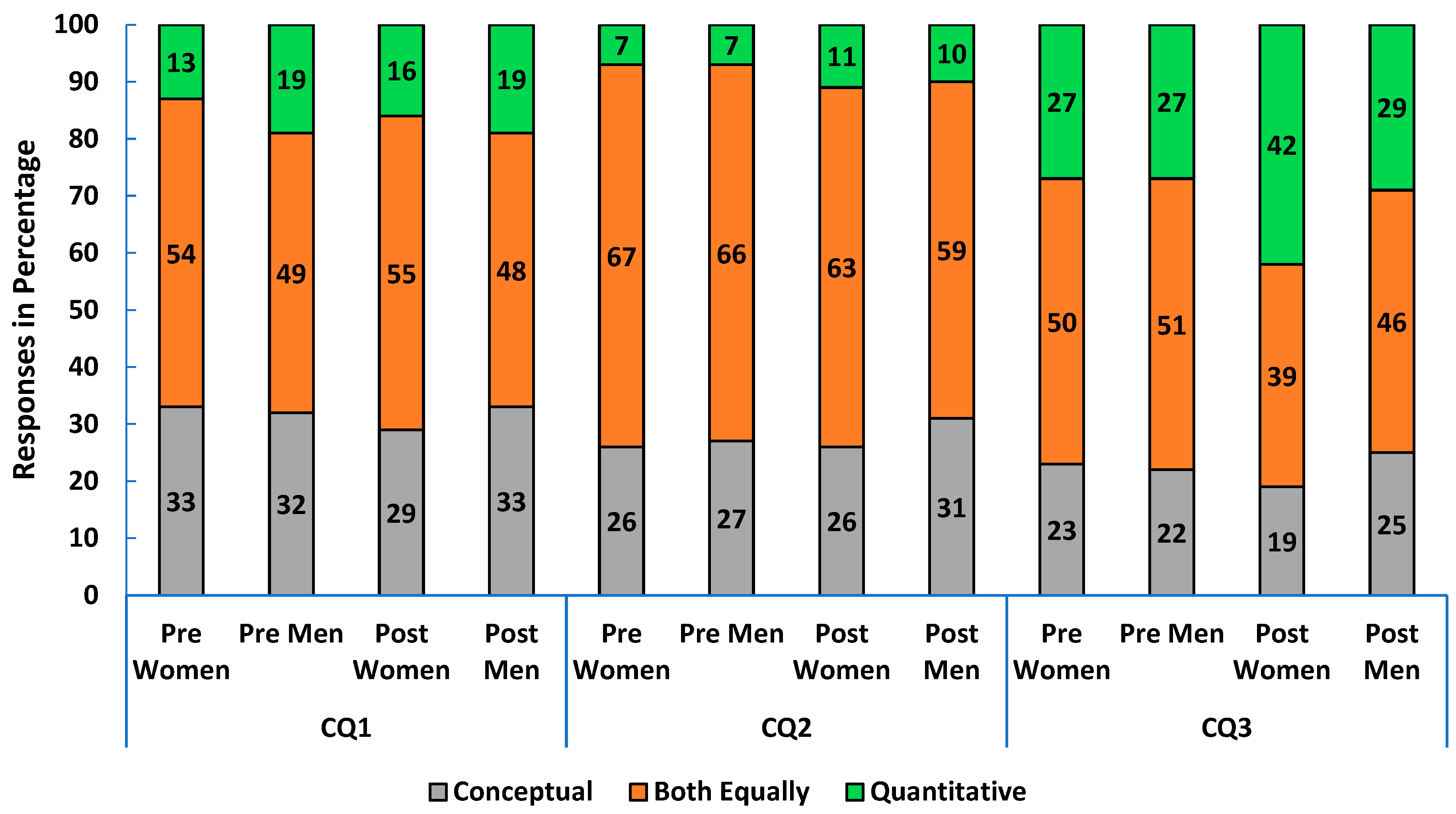 Figure 8. Pre- and post-course survey responses from women and men in graduate physics courses: (CQ1) what students wanted the course to improve (conceptual, quantitative, or both skills), (CQ2) what they thought their instructor wanted, and (CQ3) what they felt the course actually improved.
