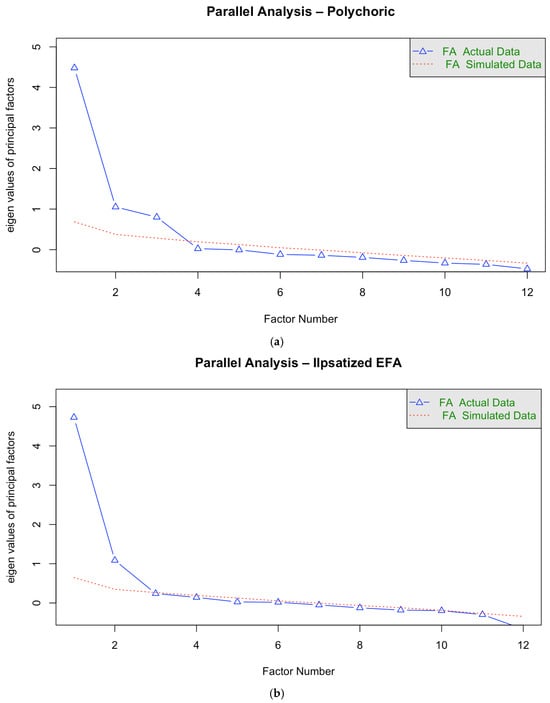 Multivariate normality was assessed using the Henze–Zirkler test, which indicated a violation of the normality assumption, HZ = 1.08, p < 0.001. While univariate skewness and kurtosis values for most variables were within acceptable ranges (skewness < ±1.07, kurtosis < ±0.68), the violation of multivariate normality confirmed the need for a robust extraction method; accordingly, principal-axis factoring was employed for subsequent EFAs rather than maximum likelihood.