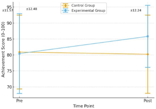 The results in Table 4 reveal no statistically significant difference between the two groups in the pre-intervention phase, indicating that the experimental and control groups were comparable in their initial achievement levels (t(128) = −0.15, n.s.). However, after the intervention, the experimental group showed significantly higher average achievements compared to the control group (t(128) = 2.05, p < 0.05). Cohen’s d = 0.45, indicating a medium effect size. A paired-samples t-test for the experimental group demonstrated that their post-test scores were significantly higher than their pre-test scores (t(67) = 6.48, p < 0.001).