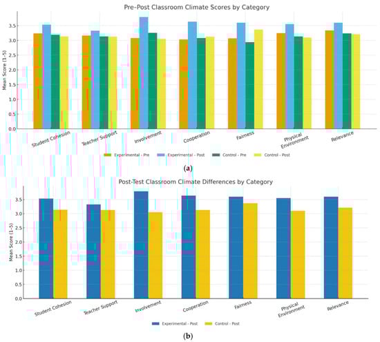 (a): “Pre–post classroom climate comparison (all dimensions)”. (b): “Post-test classroom climate differences by dimensions.