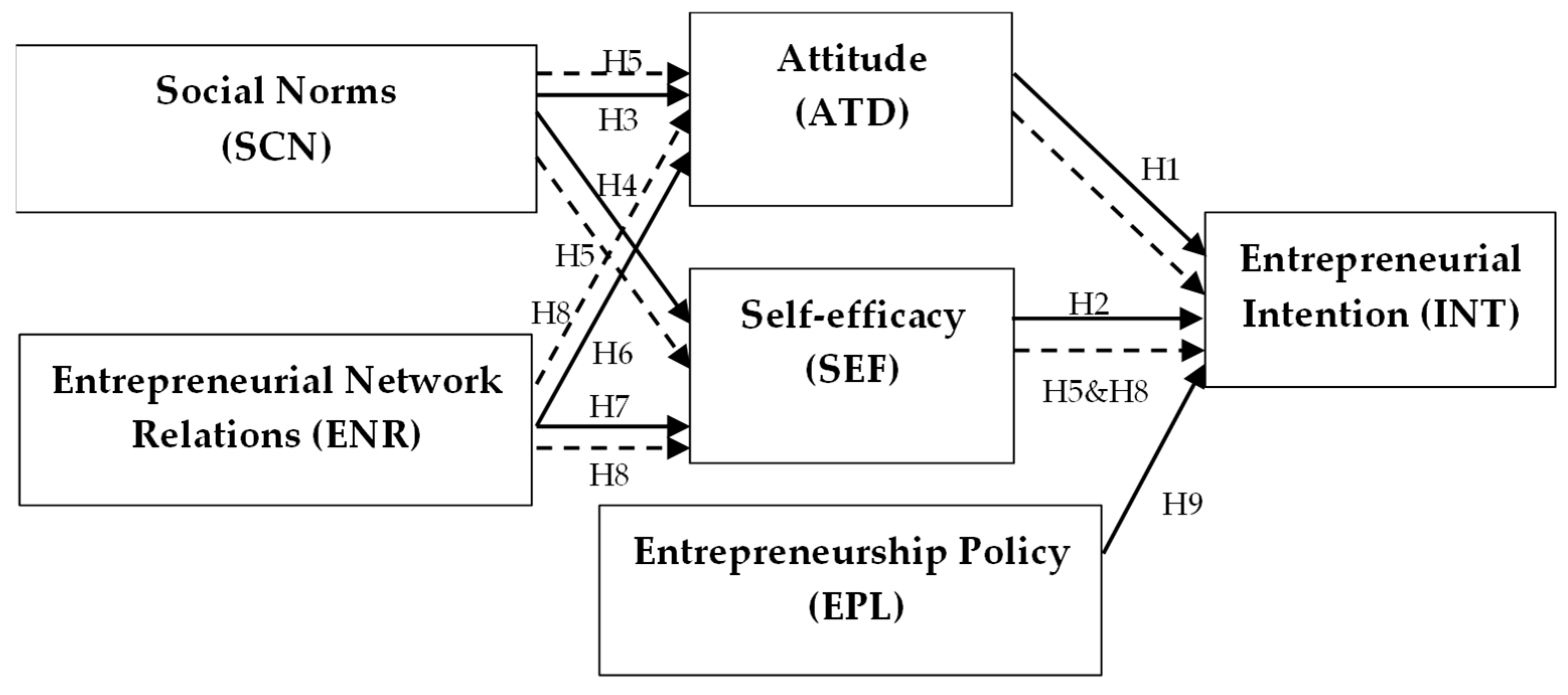 - Guo, R., Yin, H., & Lv, X. (2022). Improvisation and university students’ entrepreneurial intention in China: The roles of entrepreneurial self-efficacy and entrepreneurial policy support. Frontiers in Psychology, 13, 930682. [Google Scholar] [CrossRef]