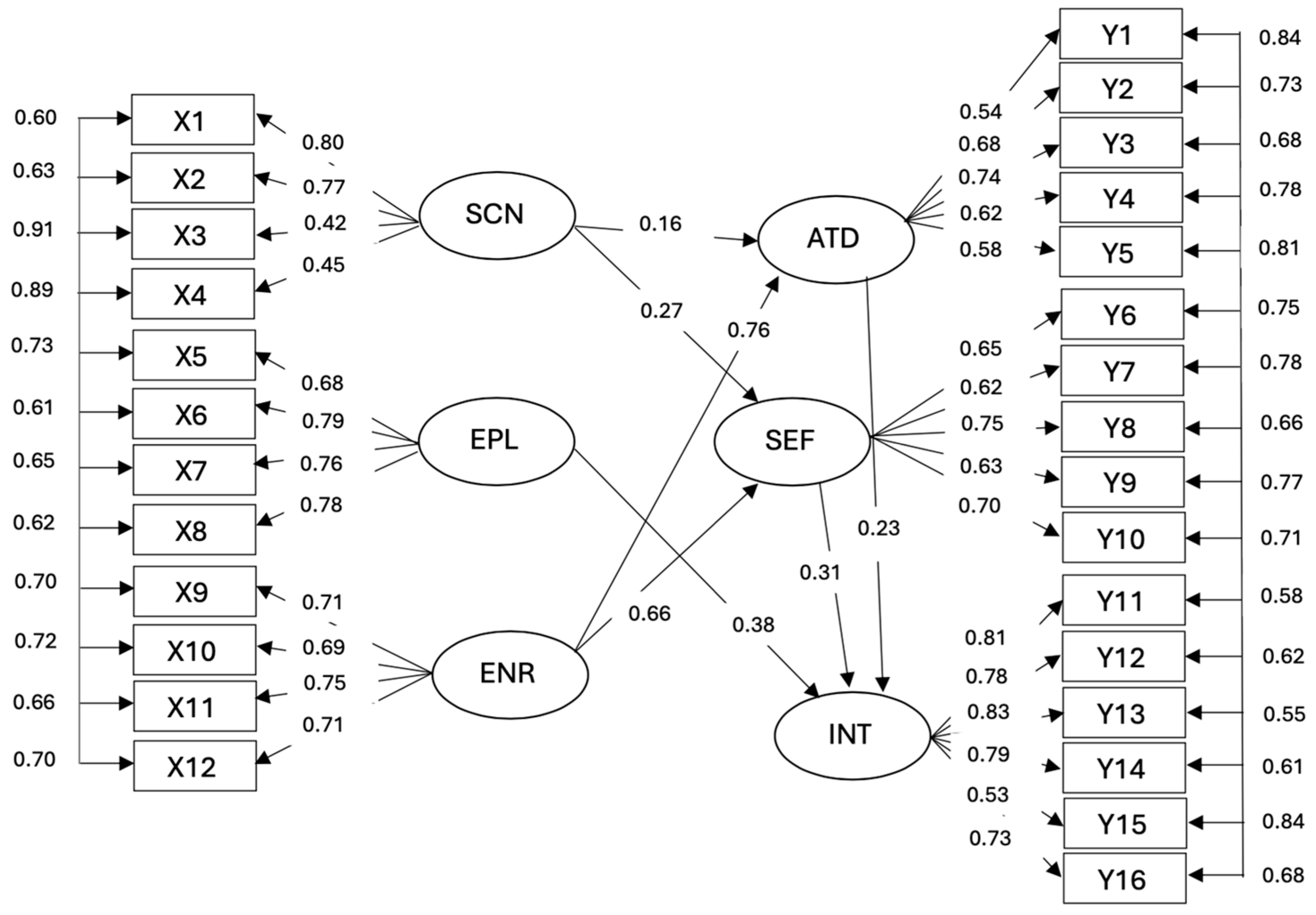 - Analyze the indirect effects of (SCN) and (ENR) on (INT), mediated by (ATD) and (SEF).