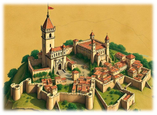 Illustrated representation of a walled medieval city that provides context for the Autolycus’ Game (AI-generated).