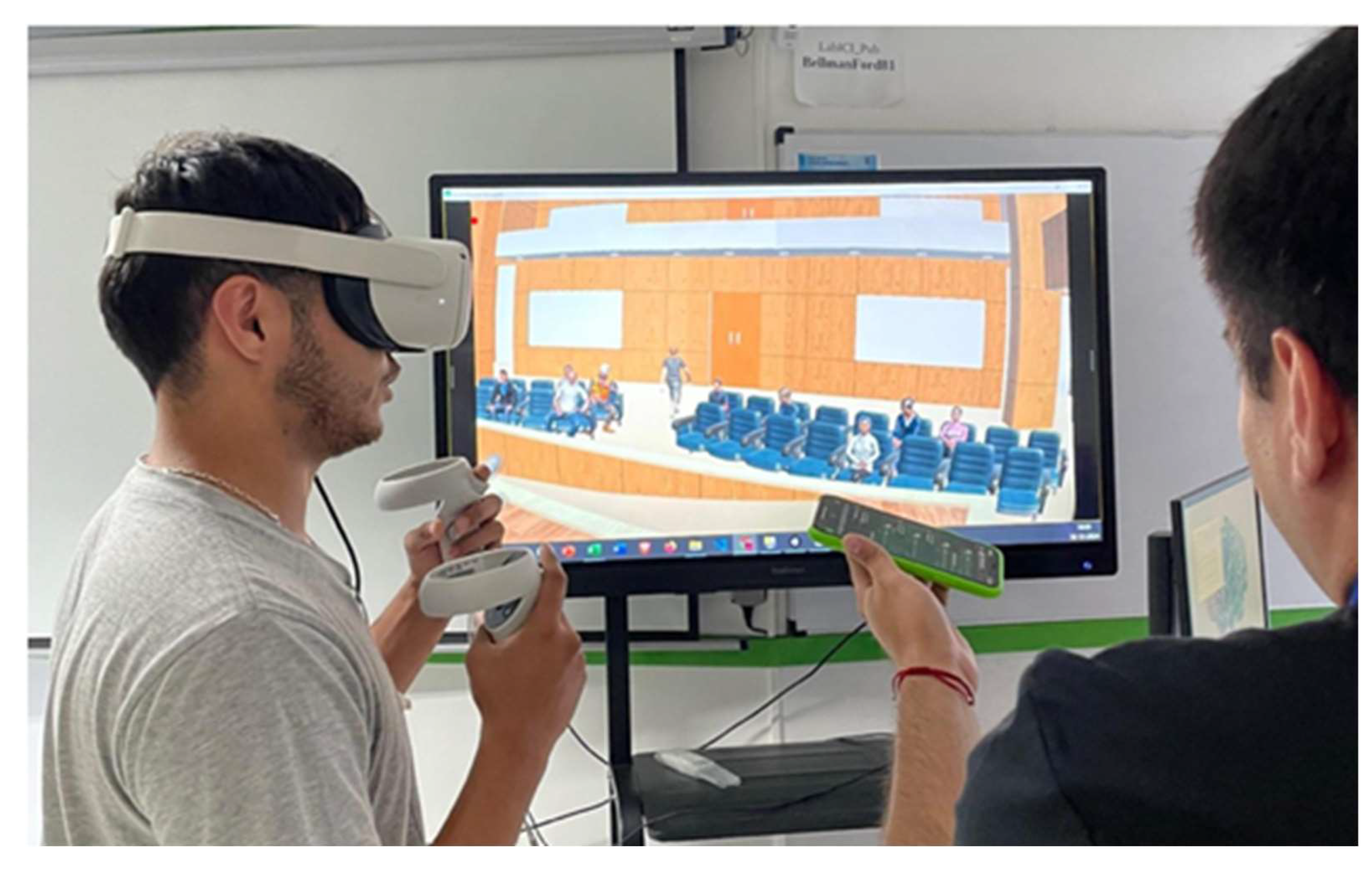 Figure 2). The experimental phase initiated with the registration of each participant’s ID in the web platform. Participants subsequently interacted with the VR system for approximately 10 min, during which they received instructions on operating the VR controls and familiarized themselves with the virtual tools. Once acclimatized, students entered the virtual auditorium to present their prepared texts. At the commencement of the presentation, participants received instructions aimed at anxiety management. If a participant exhibited prolonged silence, evaluators provided feedback to encourage further elaboration on their points.