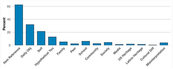 To respond to this question we will use the coding and scoring from our human scorers. Findings indicated clearly that culture and language need to be taken into account when examining student expressive language. Culture and language, however, are very large concepts that need to be deconstructed. Based on human coding shown in Table 2, we coded responses into 10 categories in the socioecological rubric, with approximately 63.7% in English and 36.3% in Spanish in the ELVA project. Furthermore, 55.9% of student responses contained at least one socioecological component specified in the rubric for the ELVA measure and 66.5% for the MELVA-S measure. Figure 2 shows the percentage of students referencing this information in the ELVA project, while Figure 3 shows the frequency that socioecological factors were referenced within MELVA-S.