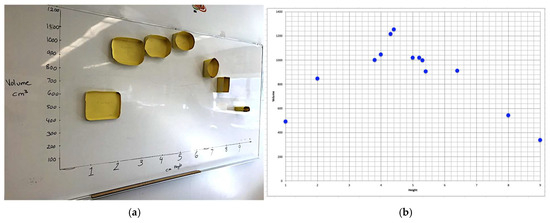 When we calculated the volume of each basket and created two graphs showing the relationship between volume (vertical axis) and the height of the walls (horizontal axis), students could see the same rough bell curve that mirrored what they had observed in the measuring cups of soy nuts (Figure 10). We created one graph by calculating the volume of different card stock baskets and physically placed them on a graph on the whiteboard. The other graph was generated using Excel. The curve is not perfect because the students were creating baskets rather than rectangular prisms, but the shape of the data led to some interesting discussions about the relationship between the base, the height, and the capacity or volume of the baskets.
