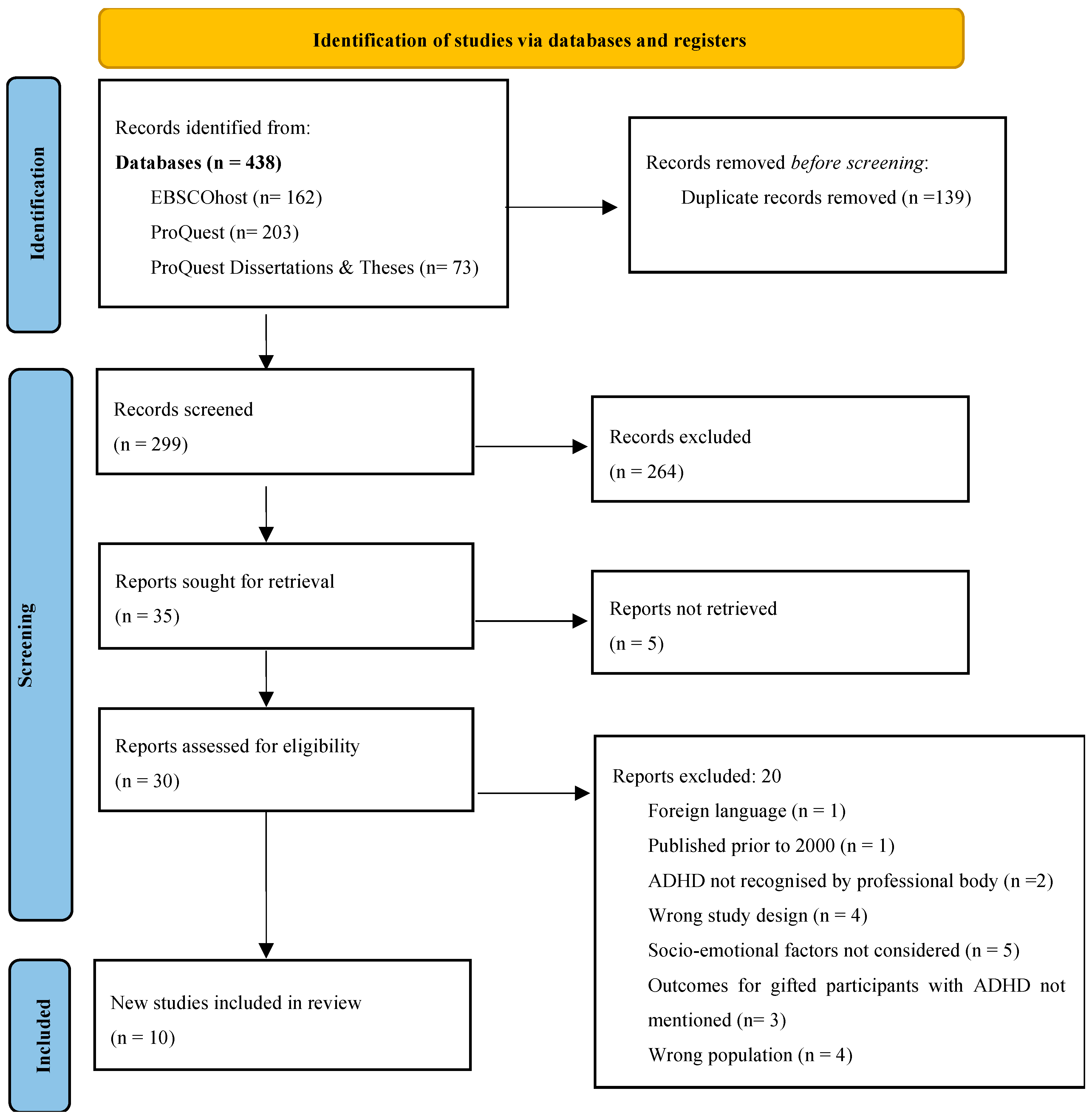- Publication Period: Studies published between 2000 and 2024 were included, as the term twice-exceptional only became an officially recognised the early 2000s.