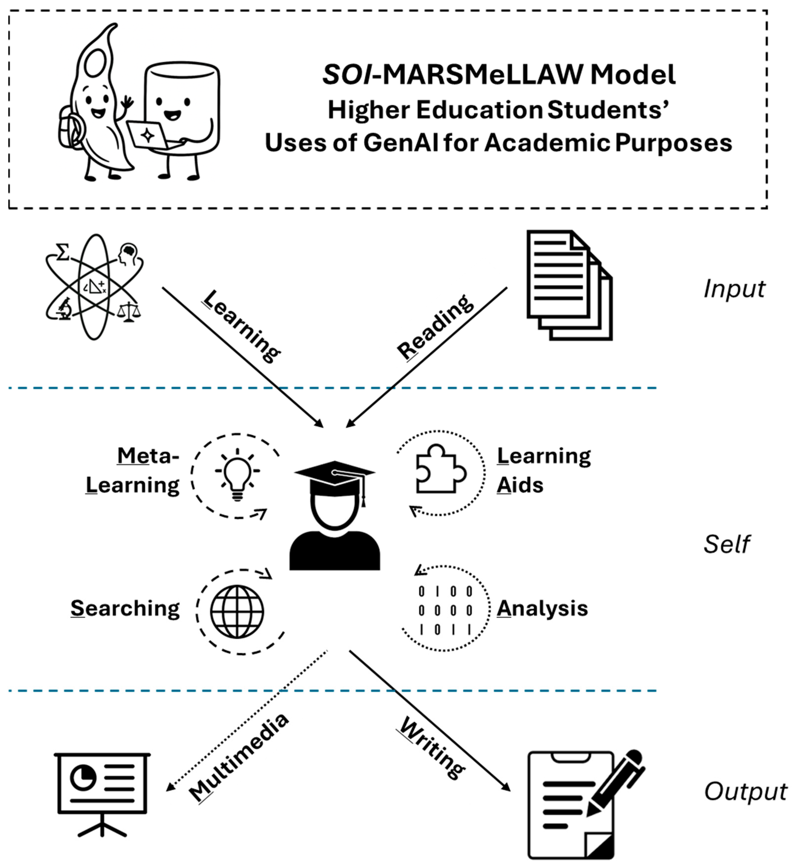 These themes reflect different technology-mediated relationships between students and various academic resources, and some meaningful technology-mediated relationships between students and themselves. We can divide these relationships into three major channels of information flow: Input, Output, and Self. Input-related themes include Reading, in which students engage with academic materials, and Learning, in which students engage with domain-specific or general knowledge—both refer to situations in which students implement GenAI-based tools in ways that information flow inward, to them. Output-related themes refer to students’ engagement with artifacts they create for communicating knowledge with others: Writing (of assignments) and Multimedia (mostly creating presentations); in these cases, students implement GenAI-based tools in ways that information flow outward, from them. Self-related themes are those in which students communicate with themselves, sometimes related to other academic resources; these include Meta-learning, for brainstorming and learning management; Searching of various information; Learning Aids, mostly for making exam preparation more effective; and Analysis of data. This framework—to which we refer as SOI-MARSMeLLAW (with SOI stands for Self, Output, Input)—is visually presented in