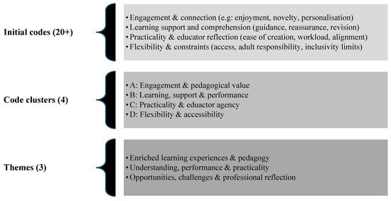 The discussion interprets three themes generated through the coding process, which reflects recurring patterns across student reflections and the educators’ practitioner journal. To move beyond description, the themes were examined in light of the existing literature, the study’s theoretical framing, and the educator’s professional context. This approach recognises that students’ positive reactions and the wider systemic conditions operate together to shape the role of AI-generated podcasts in HE. To illustrate the analytic progression from initial coding to theme development, Figure 1 provides an overview of the coding structure and the relationship between the stages of analysis.