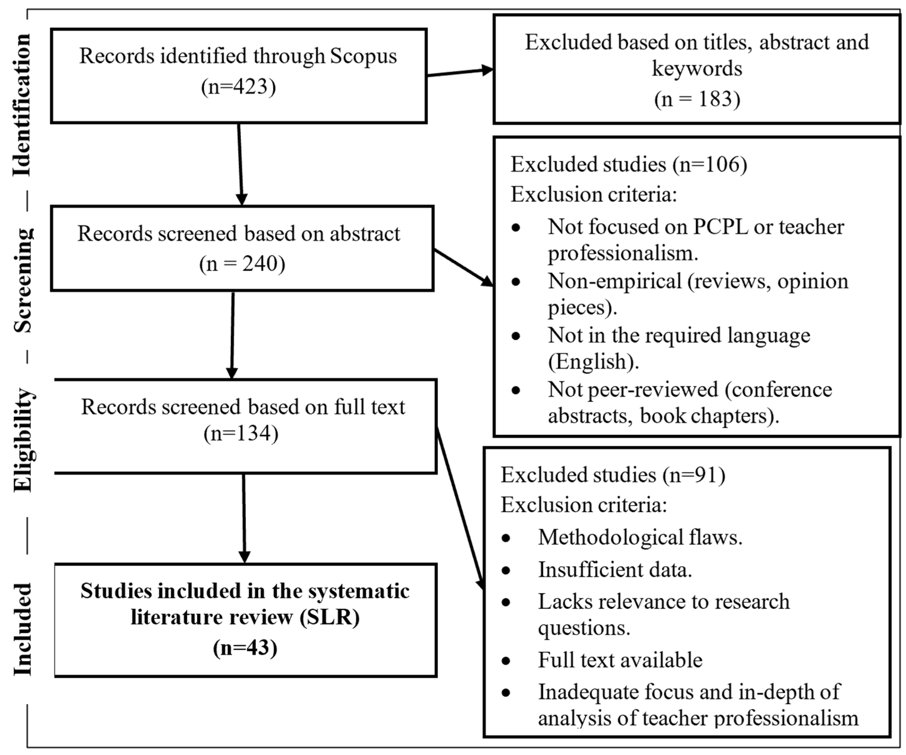 - Identification: An initial search in Scopus generated 423 articles. Following a review of titles, abstracts, and keywords, 183 records were excluded for not addressing core themes such as PCPL, teacher professionalism, or relevant frameworks.