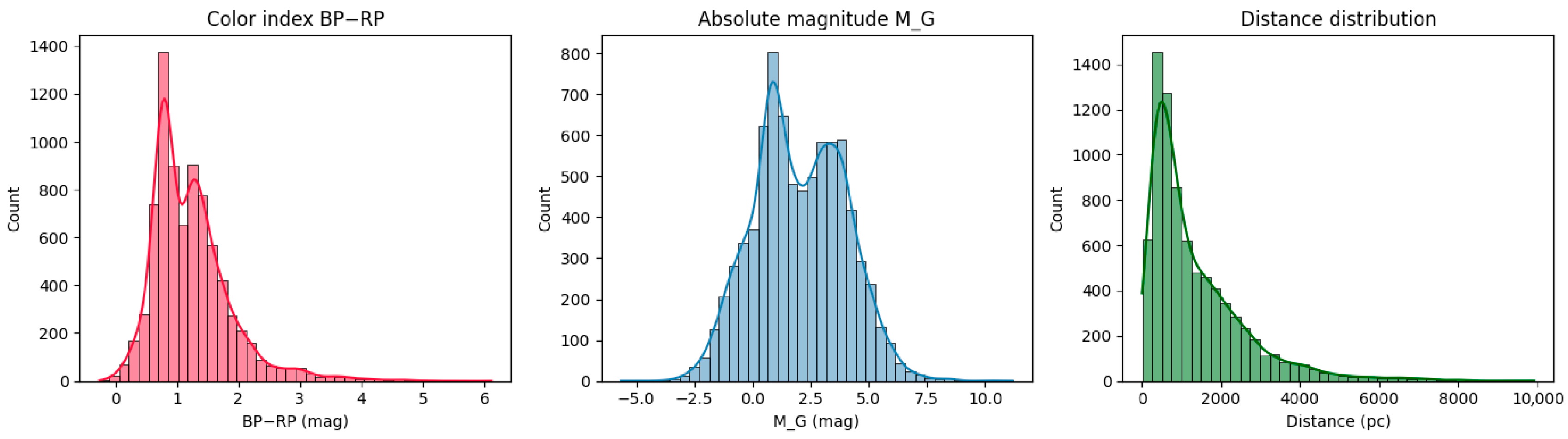 - The color index (BP_RP) shows a clear bimodal structure, with a dominant peak near 1.0 mag, corresponding to solar-type (G–K) stars, and a smaller group at BP_RP < 0.5, associated with hotter A–F type stars. This distribution reflects the prevalence of mid-temperature stars in the local Galactic neighborhood.