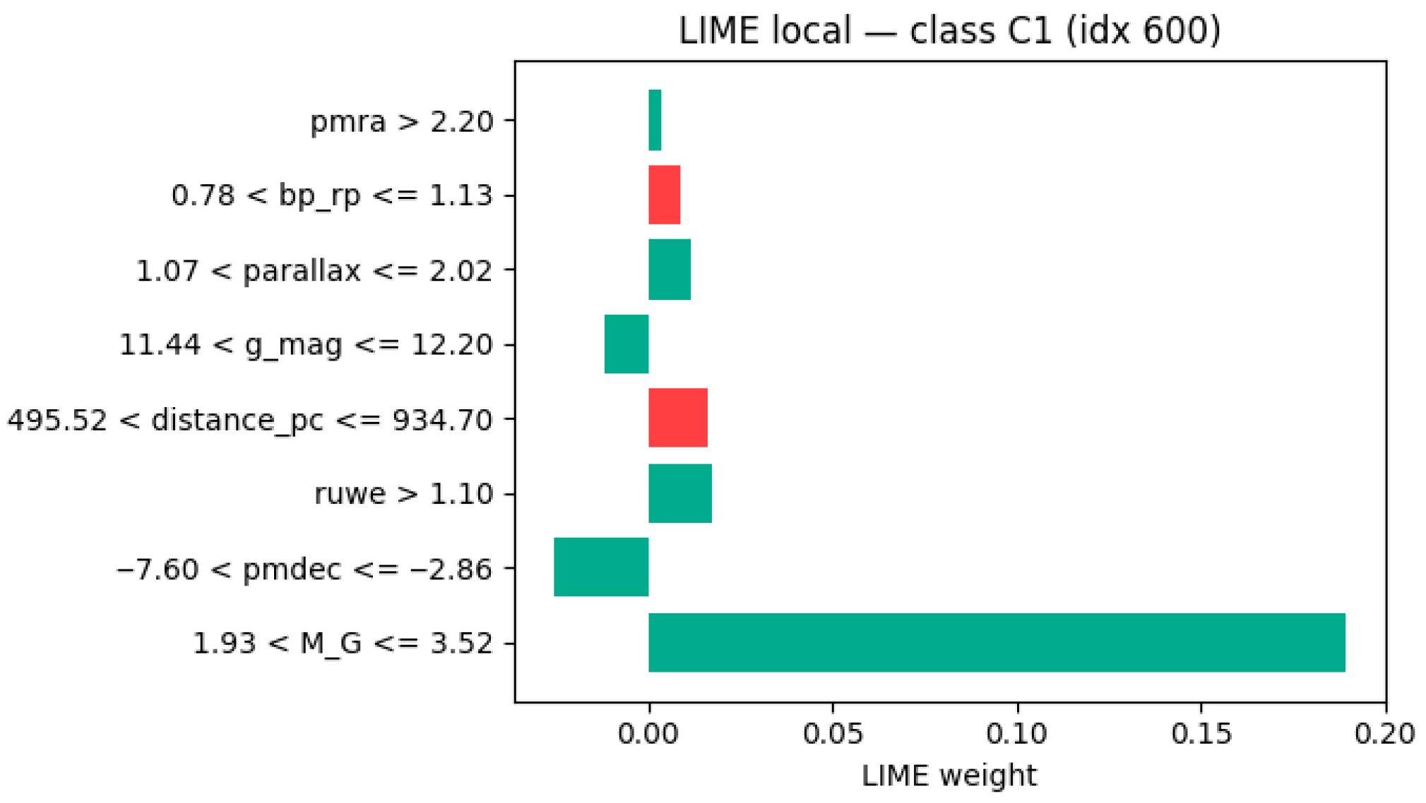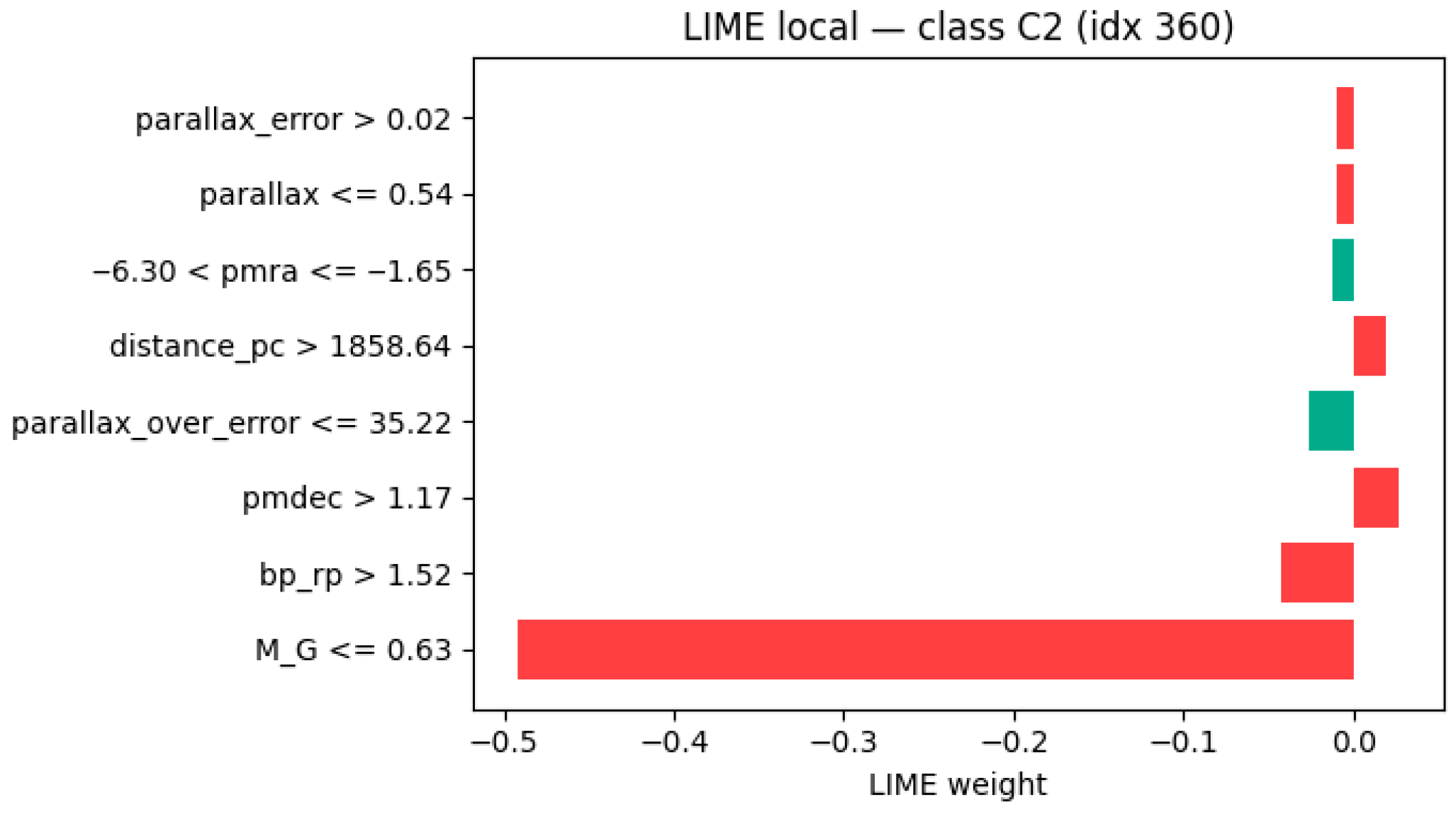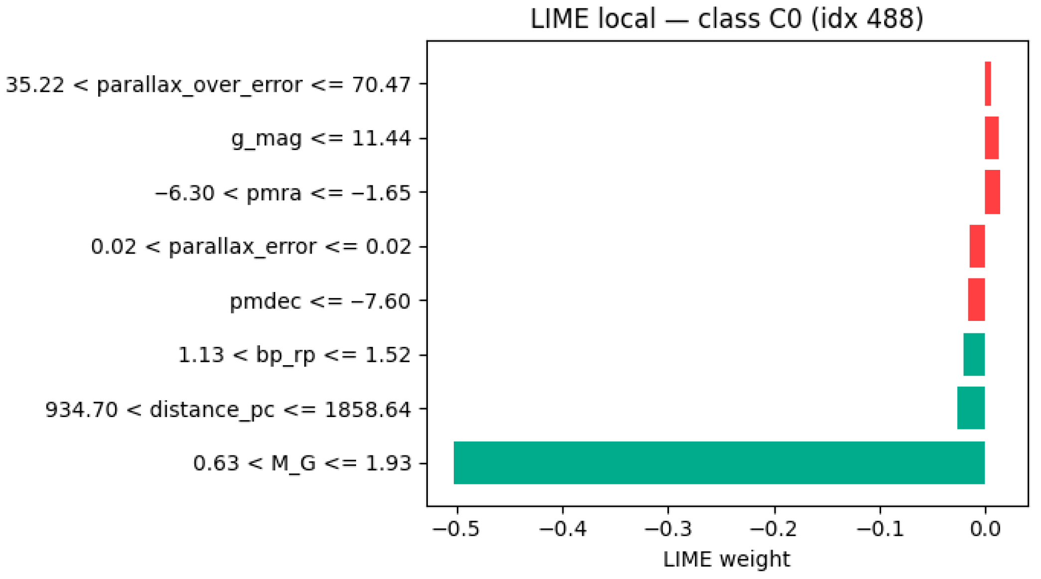 - Local explanations, based on LIME, were used to explore the behavior of the model around specific examples, representative stars or ambiguous data points. For each instance, LIME builds a locally weighted linear surrogate model: