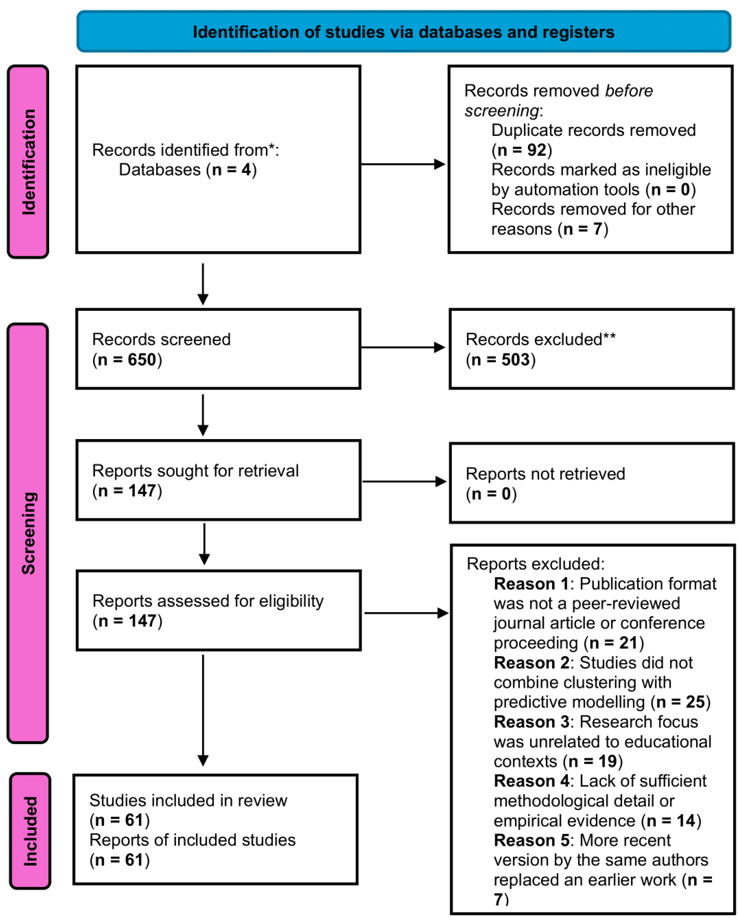 Future research should prioritise addressing these identified challenges to maximise the impact of clustering and predictive models in EDM. Techniques aimed at improving computational efficiency, such as optimised clustering algorithms and automated feature selection methods, require further development and testing. Efforts should also focus on enhancing model generalisability through expanded datasets collected from diverse institutions and regional contexts. Establishing transparent reporting standards and comprehensive ethical guidelines is critical for mitigating biases and safeguarding student privacy. Additionally, aligning institutional strategies and objectives with data-driven methodologies is essential for equitable and widespread adoption across educational settings. Future reviews could benefit from including broader datasets, multilingual studies, and additional modelling approaches, thus providing a richer and more inclusive understanding of how clustering and predictive techniques can enhance educational practices and outcomes to ultimately strengthen institutions’ ability to detect disengagement early and deliver interventions that prevent dropout, improving both academic outcomes and student wellbeing.