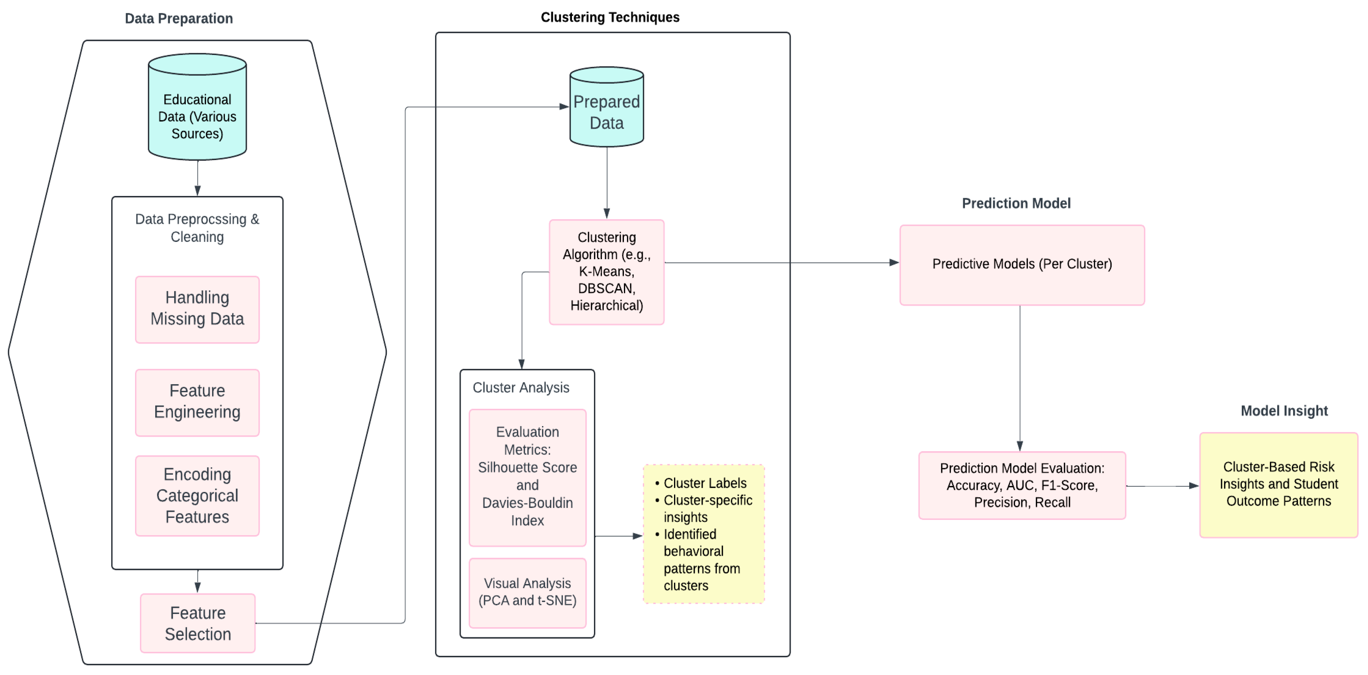K. Na & Tasir, 2017). This demonstrates that clustering not only benefits from well-engineered inputs but also serves as a feature engineering step for downstream predictive models. Integrating diverse data sources allows these models to identify at-risk students with greater precision, even in complex and varied learning environments (