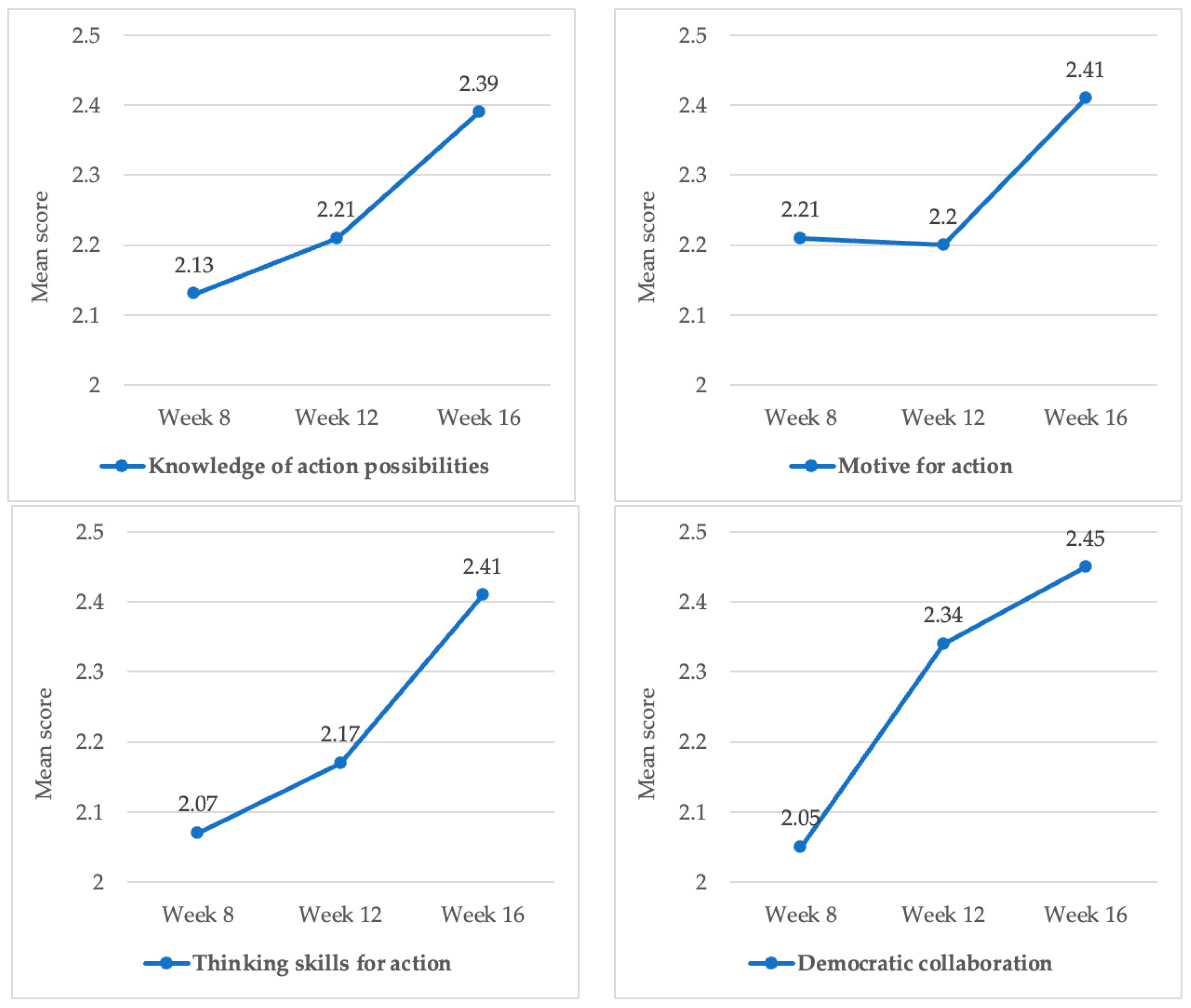 | Student action competence questionnaire | 37 Grade 8 students | Quantitative | To measure four dimensions of students’ action competence: knowledge of action possibilities, motive for action, thinking skills for action, and democratic collaboration | Weeks 8, 12, and 16 |