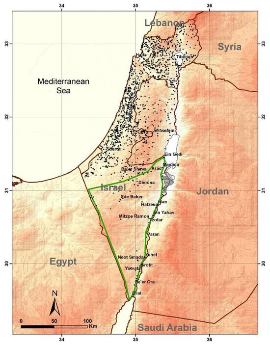 The research area is within the green triangle. The black dots indicate settlements in Israel.