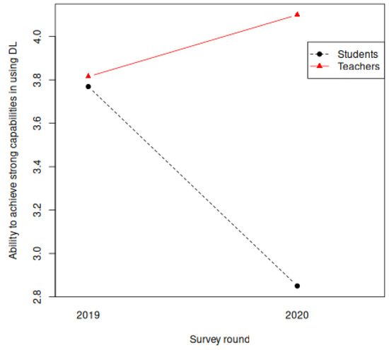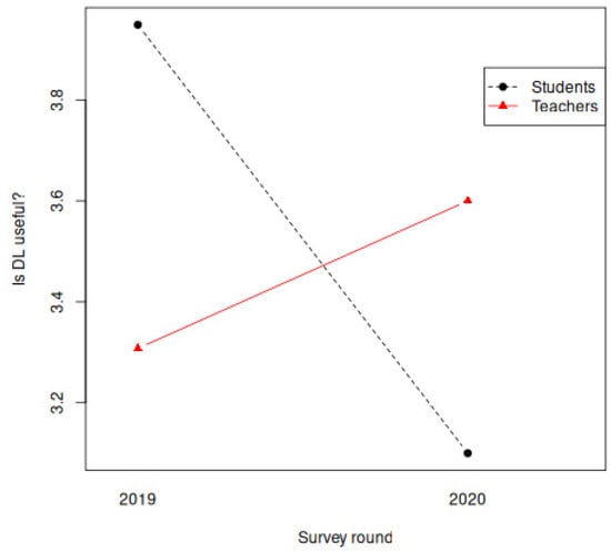 An interesting finding relates to the question of whether DL is useful. As seen in Figure 4, there was an increase in the teachers’ ratings regarding the usefulness of DL, from M = 3.31 to M = 3.60 from 2019 to 2020; on the other hand, there was a decrease in the students’ ratings, from M = 3.95 to M = 3.10.